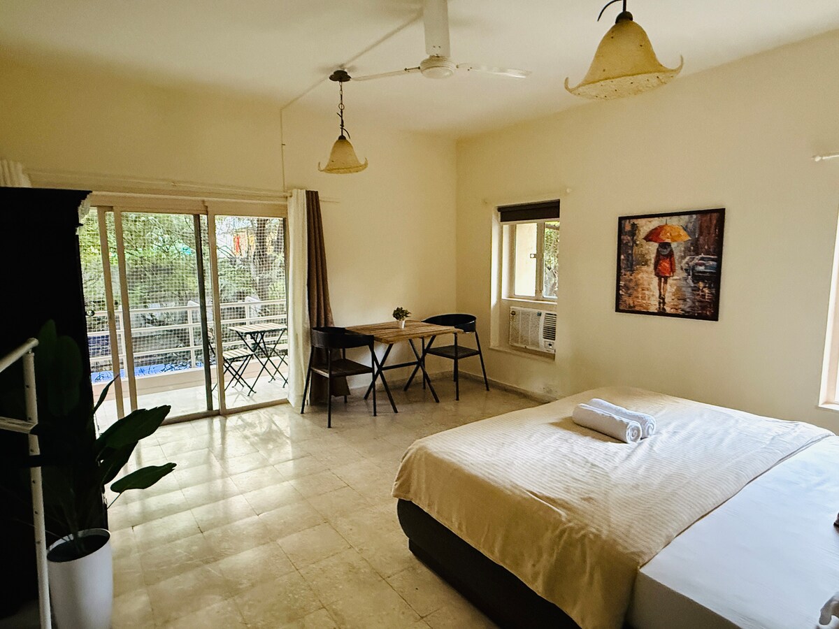 ✨ Doordacht ontworpen studio in de buurt van de luchthaven van Pune — comfort, rust en gemak in één verblijf. 🌿 Geniet van een gezellig interieur, snelle wifi, airconditioning, een smart-tv en een balkon dat perfect is voor een kopje koffie in de ochtend. Licht koken in de kitchenette en zelf inchecken voor het gemak. Ideaal voor zakenreizigers of koppels die op zoek zijn naar rust en privacy. Geen huisdieren, alcohol of feesten; roken alleen op het balkon. Je rustige toevluchtsoord in de stad wacht op je. 🌸 🌿 Speciale besparingen voor langer verblijf — 12% korting op wekelijkse en 22% korting op maandelijkse reserveringen.