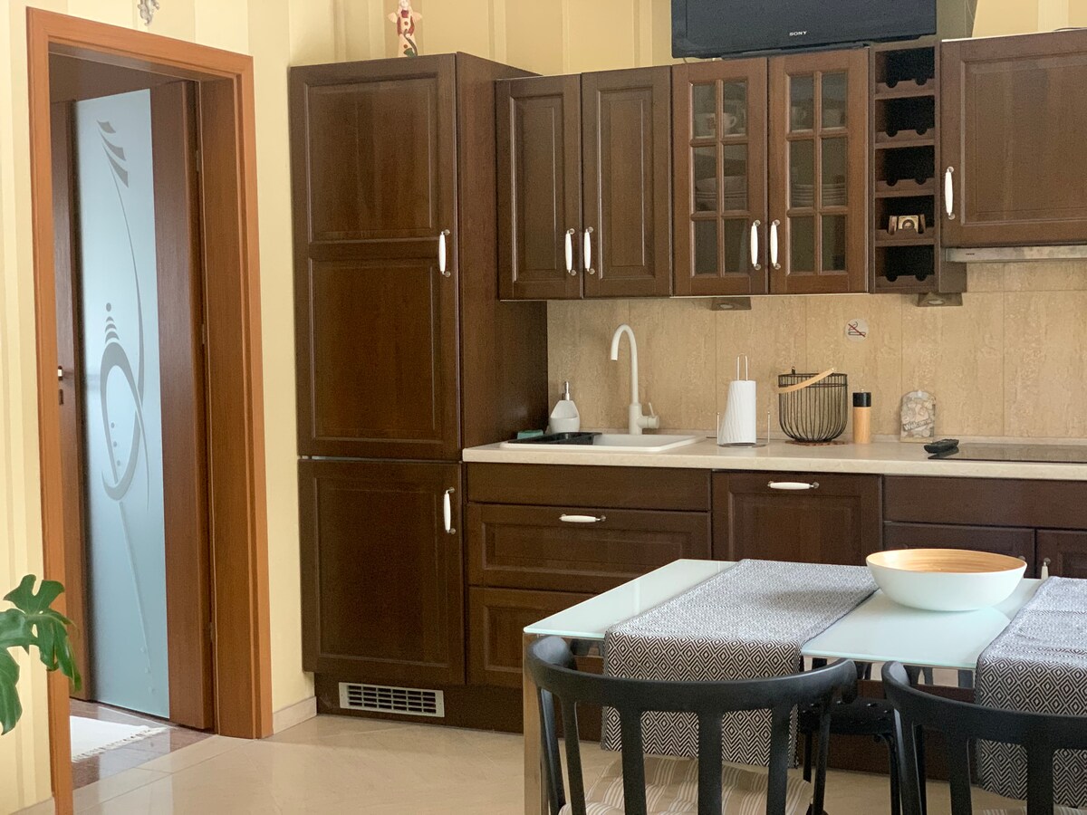 We hebben een ruim, volledig uitgerust appartement voorbereid met een complete keuken en een badkamer. Een slaapkamer met een groot bed of twee eenpersoonsbedden, een uitklapbare hoek in de woonkamer, een wasmachine in de badkamer, een droger. We streven ernaar om onze gasten zich comfortabel en veilig te laten voelen in hun eigen huis. We doen dan ons uiterste best om je verblijf in ons appartement aangenaam en comfortabel te maken.