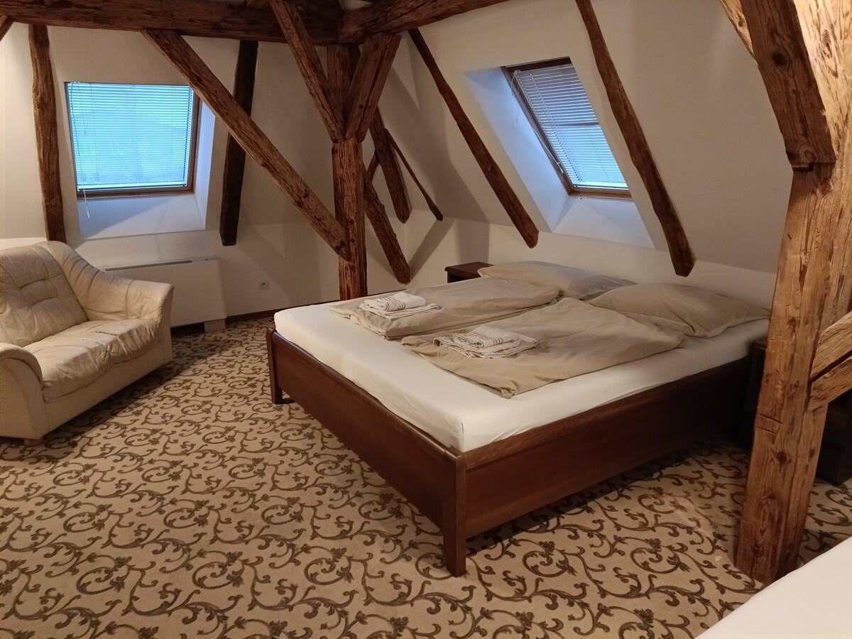 Útulná podkrovná izba s manželskou posteľou alebo dvoma oddelenými posteľami s možnosťou prístelky v blízkosti centra mesta. Vybavenie izby: veľkosť izby 20 m2 dvojlôžková posteľ možnosť prístelky za príplatok vlastná kúpeľňa so sprchou a WC uteráky a osušky WIFI bezplatne na izbe LCD TV so satelitným vysielaním