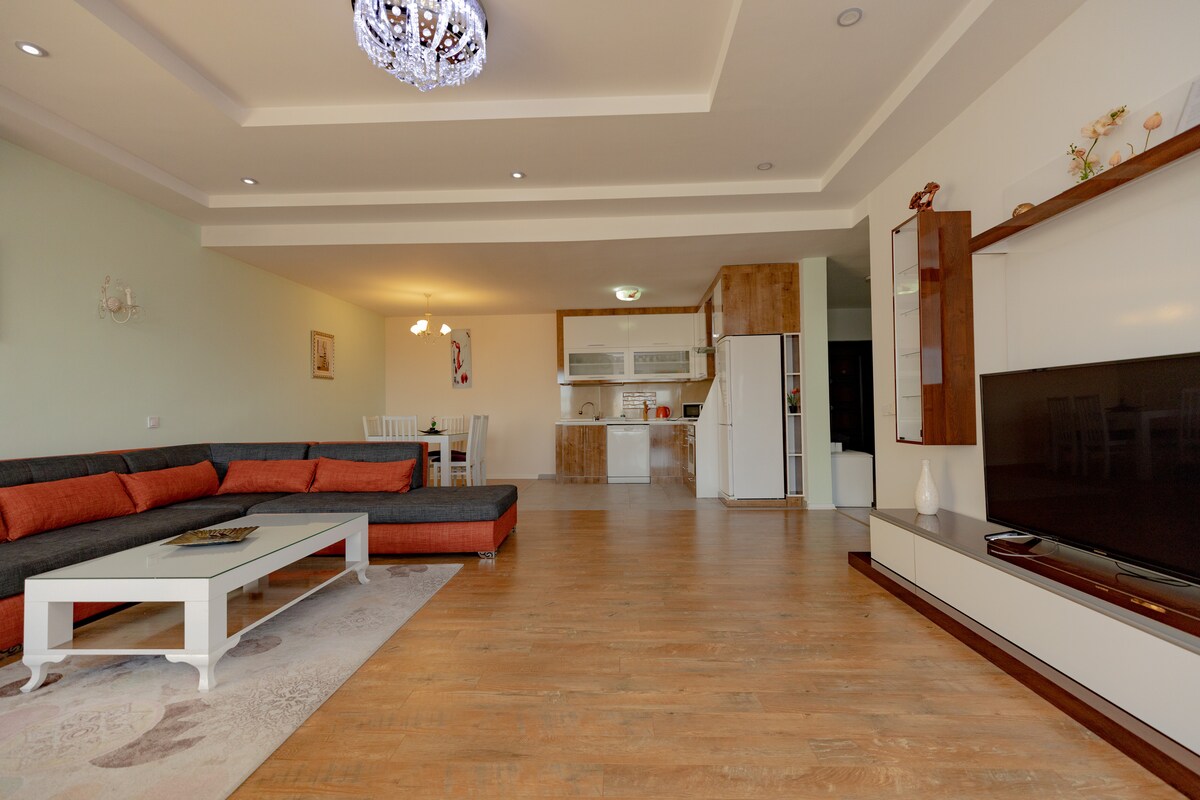 Dit penthouse met geweldig uitzicht op Prishtina is 120 m2, twee slaapkamers. het is geschikt voor 4 personen ( 2+1 +1 - ideaal voor vier - 1 tweepersoonsbed , 2 eenpersoonsbedden).Het heeft een volledig uitgeruste keuken en een woonkamer.