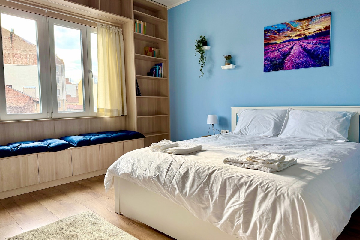 Dit rustige, romantische appartement in het historische centrum van Sofia voelt als een echt thuis. Gevuld met licht en uitzicht op de berg Vitosha, is het op loopafstand van bezienswaardigheden zoals de kathedraal, de markthal en Vitosha Blvd. Perfect voor koppels, soloreizigers of externe werknemers, het is zorgvuldig ontworpen met hoogwaardig beddengoed, snelle wifi, een complete keuken en boeken die je uitnodigen om te ontspannen.