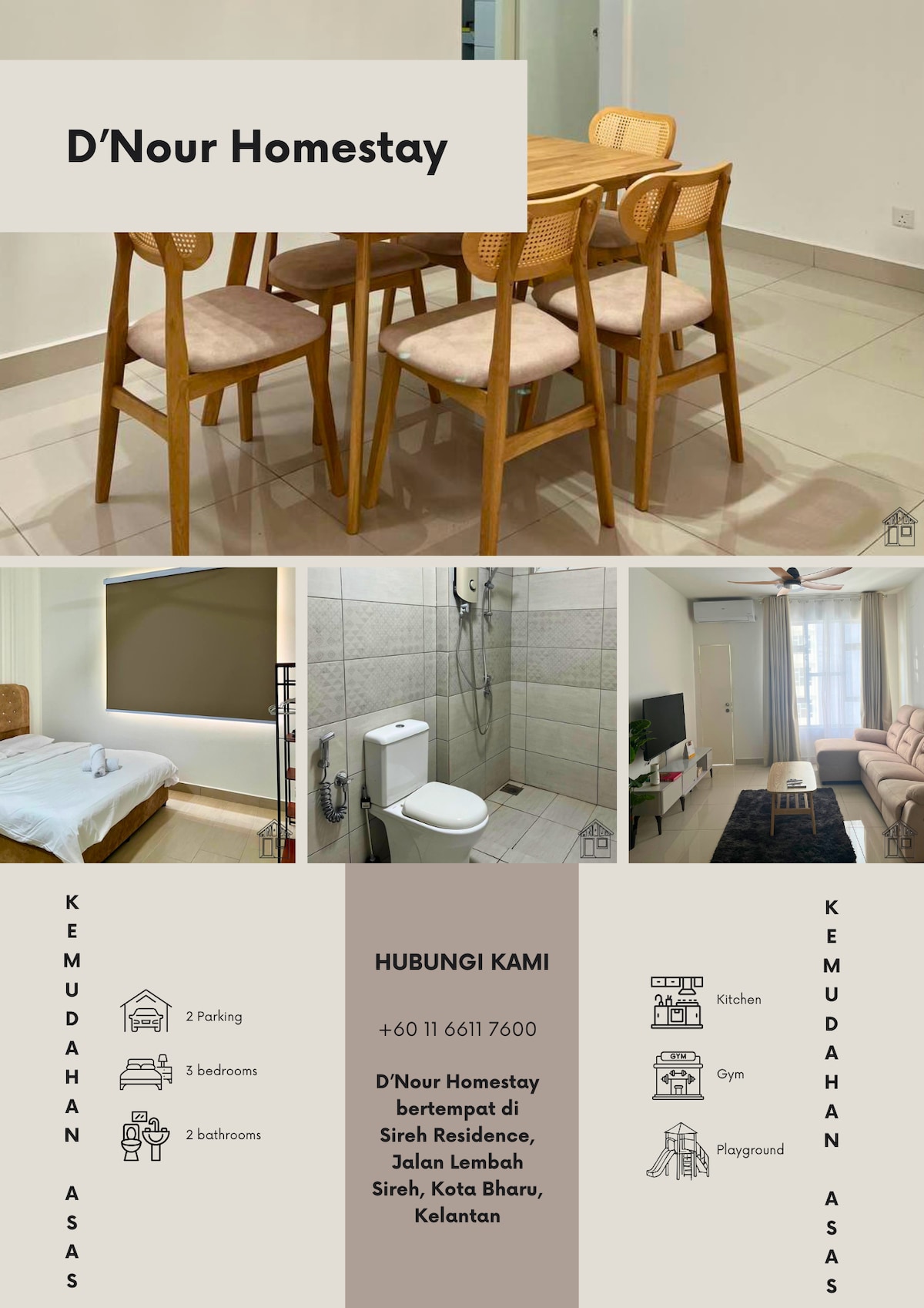 Wat is BESCHIKBAAR bij FarHa Homestay Sireh Residence Lembah Sireh, Kota Bharu: - 3 queensize bedden 🛏 Laadvermogen: 6 volwassenen Max auto: 2 (parkeerkelder) En NOG meer bieden wijⓘ NetFlix Wifi Diverse voorzieningen in de accommodatie: - ➡ Airconditioning en ventilator ➡ Keuken en basis keukengerei ➡ Eetkamer ➡ Woonkamer ➡️ Coway waterfilter ➡ Smart-tv ➡ Koelkast ➡ Magnetron ➡ Wasmachine ➡ Strijkijzer en strijkplank ➡️ Boiler ❌ Geen huisdieren toegestaan ❌ Geen alcohol