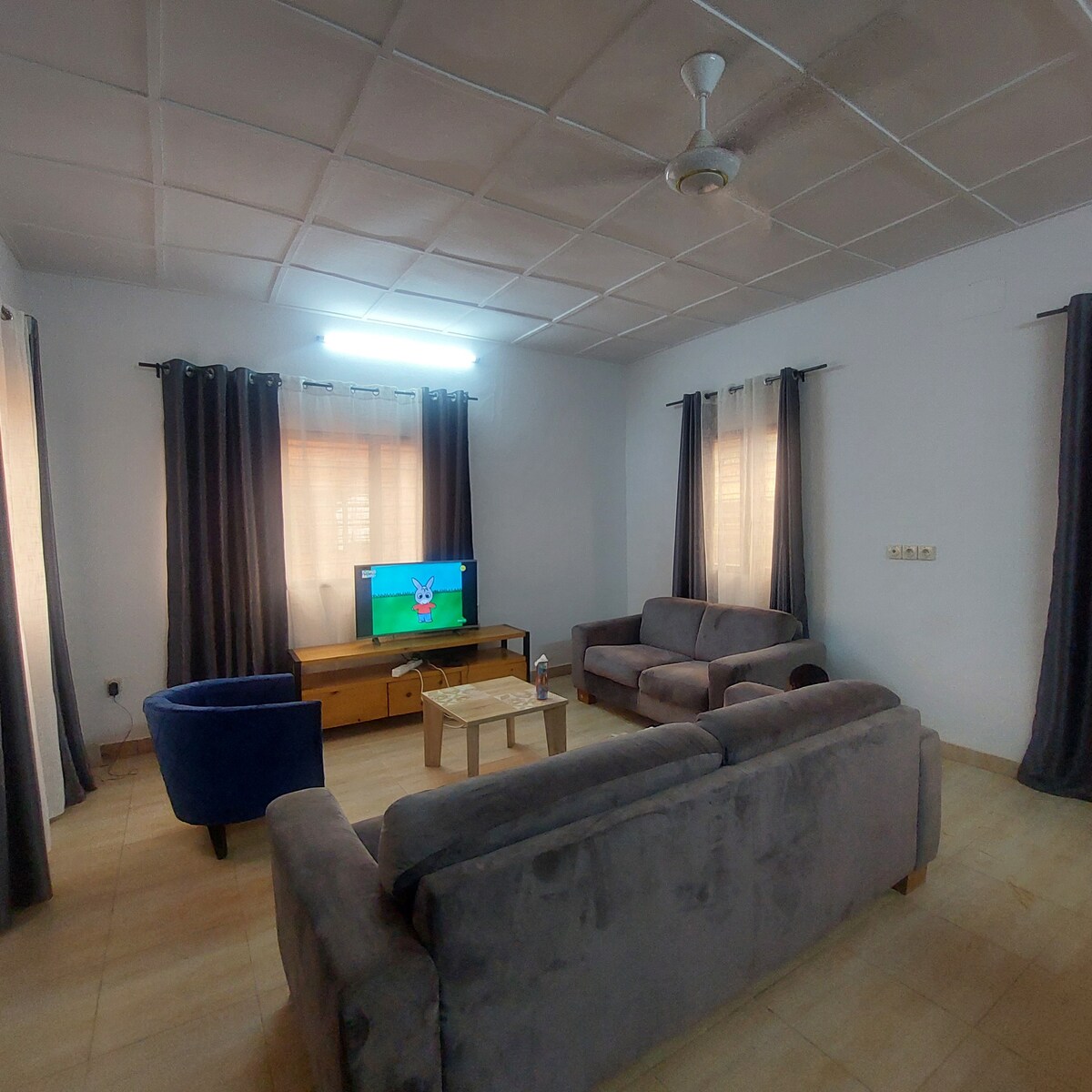 Gelegen in de rustige Kenali residentie, is villa nr. 3 van 90 m2 volledig ingericht en ingericht: uitgeruste keuken, comfortabele dubbele woonkamer (Canal + abonnement), slaapkamer met airconditioning met badkamers, terras, bijgebouw, overdekte parkeerplaats. Een ideale woning voor een zakelijk of toeristisch verblijf in het hart van de stad der koningen. Bewaken inbegrepen en onderhouds- en cateringdiensten op aanvraag. Geniet van wellness in deze unieke woning in Abomey.