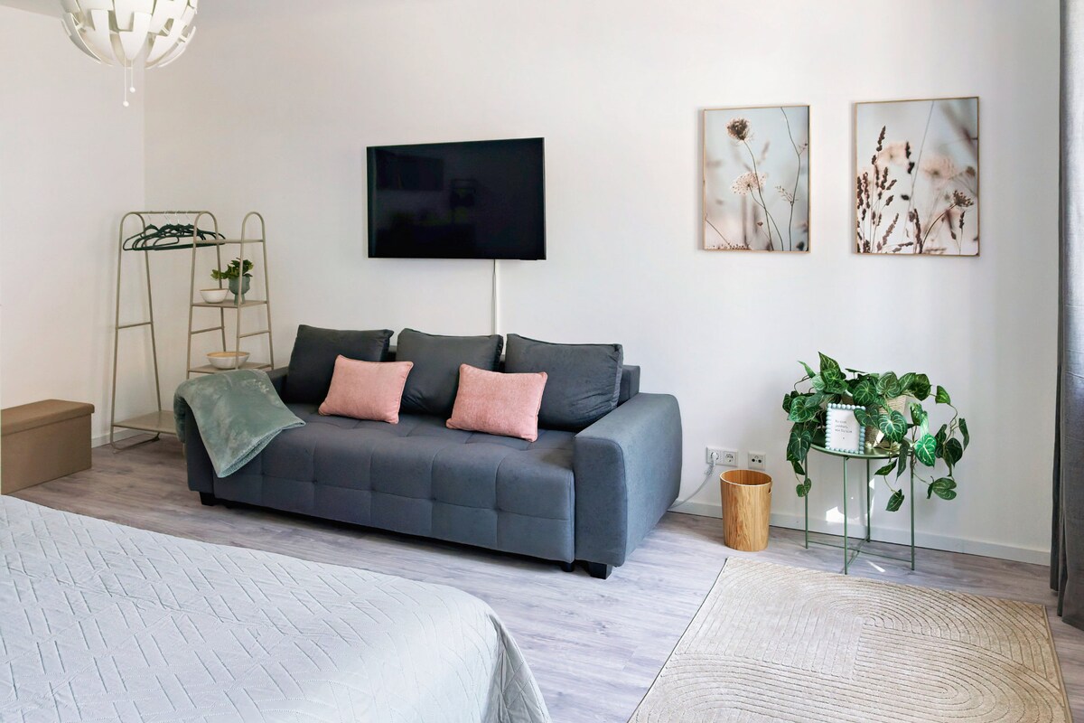 Dit prachtige appartement met 1 slaapkamer beschikt over een open woonkamer met een zithoek met tv. Het appartement is geschikt voor 3 volwassenen of 2 volwassenen en 1-2 kinderen (1 slaapbank in de woonkamer of 1 apart kinderbed). De keuken is volledig uitgerust met alles wat je nodig hebt - behalve een oven of magnetron - en er is een tafel om te dineren met 4 stoelen in de kamer. De slaapkamer heeft een kingsize bed en een kledingkast voor je spullen. De badkamer is klein en heeft een bad.