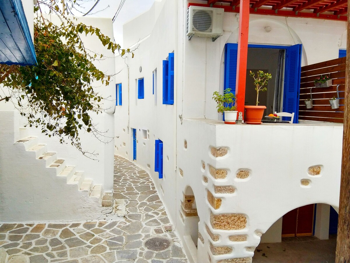 Ons traditionele Cycladische stenen huis (65 m ²) ligt in het centrum van het dorp en heeft een prachtige tuin met citroen, sinaasappel, granaatappel, abrikoos, avocado en druivenbomen, waar u kunt ontspannen en genieten van de natuur. Het appartement heeft een panoramisch uitzicht op het dorp en een adembenemend uitzicht op het eiland Naxos. Het huis is milieuvriendelijk,geschikt voor werk en heeft zonne-energie. Wifi is ook betrouwbaar voor werk. We accepteren langere verblijven. Alles wat je nodig hebt is 20 meter te voet.