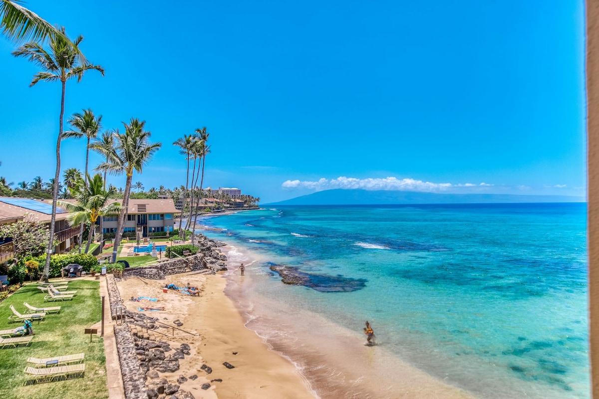 Honokowai area. Fresh & clean island vibe on the top floor, one unit away from the end. Practically hanging over the water's edge. Beautiful views of Molokai out the screened front door, as well as Lanai off the lanai. Striking floor-ceiling mirrors capture ocean views from virtually anywhere inside. Location in building catches wonderful trade winds. Listen to the sounds of the waves, just steps away & enjoy the endless sea turtle traffic right under your nose.