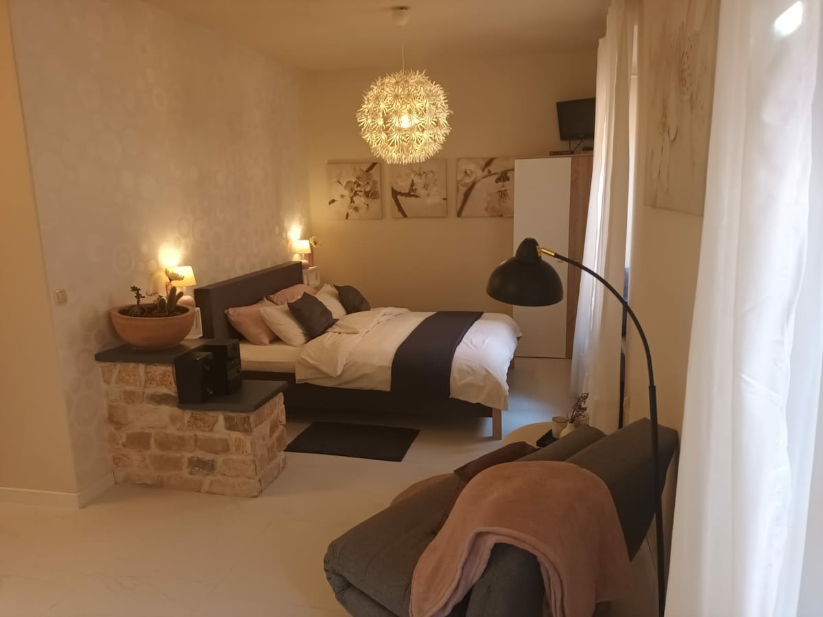 Onlangs gerenoveerde studio gelegen in het hart van de oude binnenstad van Korcula. De studio met een galeriebed (aanbevolen voor jongere reizigers) biedt het beste van deze middeleeuwse vestingstad: 1 minuut lopen naar de kathedraal van San Marco en het stadsmuseum, het strand van de oude stadsmuren en last but not least, de mogelijkheid om te kiezen uit de beste restaurants die Korcula te bieden heeft. De eigenaar zal bij de hand zijn voor eventuele hulp en antwoorden op e-mails onmiddellijk.