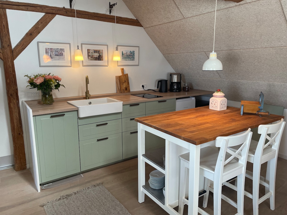 Verblijf gezellig en vredig in een oude vakwerkschuur uit de 19e eeuw. De locatie is landelijk met dieren en natuur net buiten de deur, maar toch dicht bij de stad, restaurants, entertainment, winkels en strand/zwemmen. Hier verblijft u rustig en ruim op ongeveer 120 m² met 2 slaapkamers, keuken, grote woonkamer met bank, tv en eethoek en badkamer met toilet, douche, wasmachine en droger. Naast het huis is een lommerrijk, beschut terras met barbecue direct naast weilanden met schapen en paarden. Je kunt de auto net buiten parkeren.