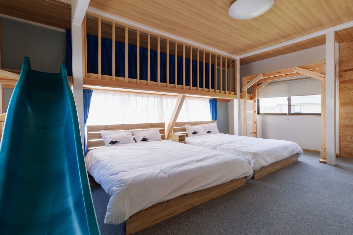 Gezinsvriendelijk huis met grote glijbaan! Dit speelse huis beschikt over een gigantische overdekte glijbaan, apenbars, een loftslaapkamer en zelfs een geheime schuilplaats voor kinderen - perfect voor regenachtig dagplezier. Slaap comfortabel met 2 queensize bedden en een onderbed, en geniet van buitenmomenten in de BBQ-ruimte met gratis grillverhuur (reservering vereist) Op slechts vier minuten lopen van station Nishi-Kumamoto Privéverhuur, ideaal voor gezinnen (tot zes personen) Babyhekje geïnstalleerd voor veiligheid Creëer blijvende herinneringen in deze unieke woning!