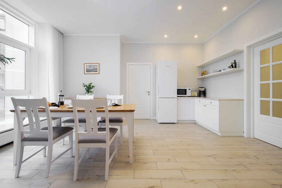 We presenteren u graag een prachtig hotel-achtig atelier in een historisch gebouw, gebouwd in 1905 jaar, gelegen in het historische centrum van de stad en het staat in de lijst van architectonische monumenten. Wij bieden onze gasten een vakantie in nieuwe, na renovatie, appartementen met hoge plafonds en een rustige binnenplaats. Goed ontworpen woonkamer met een groot bed, een uitgeruste mini compacte kittchen. Het ontwerp is gemaakt voor uw comfort en kwaliteit. 43 "ELED-Smart TV met kabel-tv, internet, WIFI