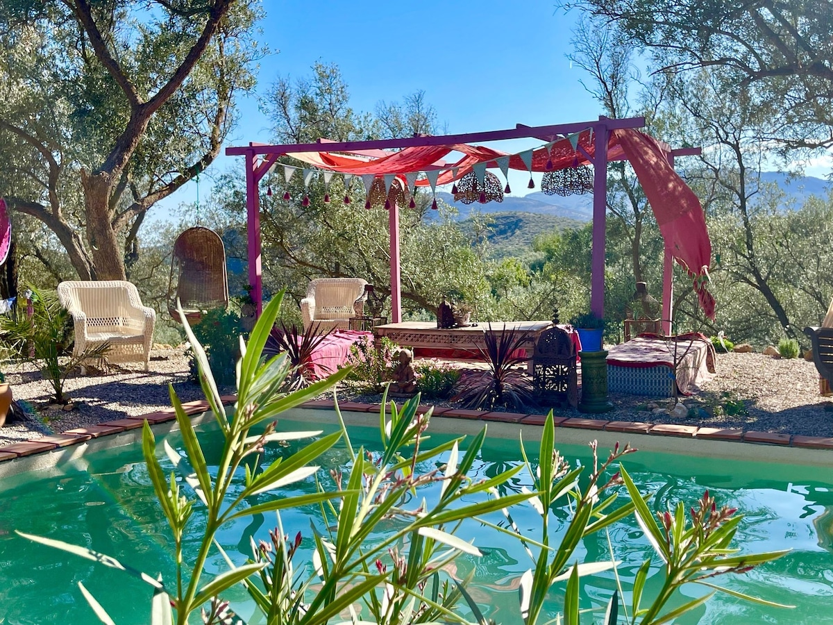 Off grid prachtige joert-site genesteld tussen de olijfbomen met twee joerten en twee kleine casita's. Perfecte plek om los te koppelen in de natuur, maar op 40 minuten loopafstand van het dorp Lanjaron. De site is ingericht met eclectische schatten van over de hele wereld, waardoor het een romantische bohemien sfeer krijgt. Geweldig zwembad met vier posterbedden en ruimtes om te ontspannen. Geniet van ontbijt op bed, luie lunches of diner onder de sterren met een geliefde of geweldig voor een kleine groep vrienden