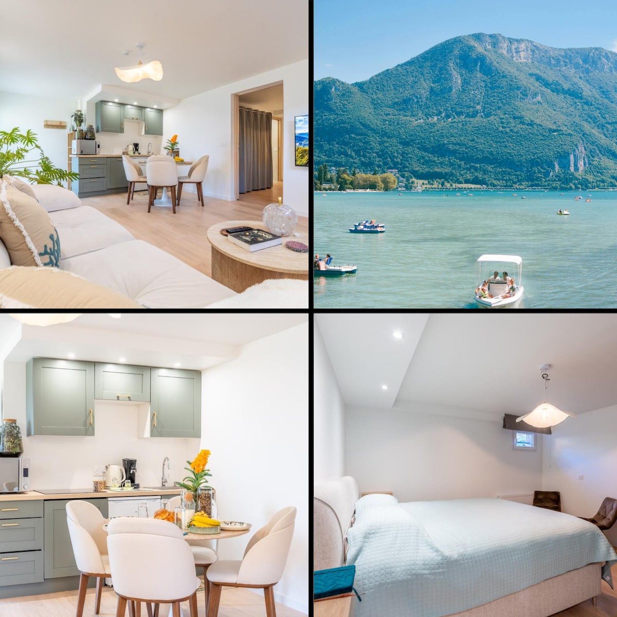Gezellig, licht appartement met uitzonderlijk uitzicht op rustig aangrenzend terrein met fietspad, 75m van het meer, dichtbij winkels (bakker, supermarkt, kapper, pizzeria, restaurant, tennis, haven met diverse watersport en fietsverhuur) . Ideaal voor wandel- en fietsvakanties. Annecy op 20 minuten met de fiets. Begin met wandelen. Skigebieden (helling en Nordic) vanaf 45 minuten met de auto, ( Semnoz, Seythenex, La Clusaz, Le Grand Bornand).