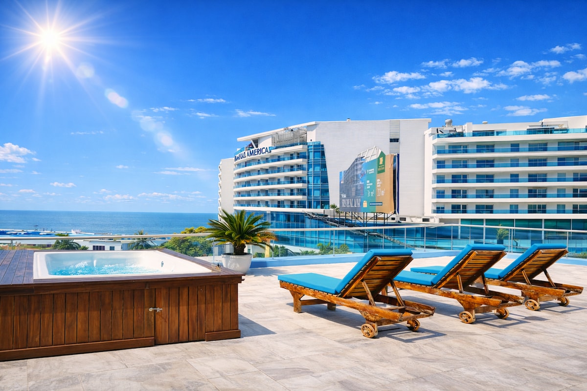 Ons elegante appartement is gelegen in een van de meest complete en moderne gebouwen in de exclusieve 'Cielo Mar' -sector, op een paar meter van een van de beste stranden in de stad 'Playa Azul', op 10 minuten van het historische centrum en op 5 minuten van de luchthaven . Het appartement heeft een buitengewoon uitzicht op de baai en de oceaan waar je kunt genieten vanuit de privéjacuzzi op het balkon of in de ongelooflijke overloopzwembaden op het dak met jacuzzi's, sauna, terrasbar en barbecue
