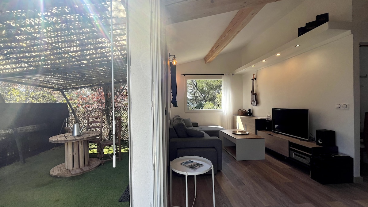 Onder de dennenbomen, huis van 50 m², perfect voor 4 personen met zijn 2 slaapkamers (dubbele modulaire bedden of twee eenpersoonsbedden), de doucheruimte, de keuken en een woonkamer open naar het terras en de tuin. Het zwembad en het poolhouse zijn 24 uur per dag toegankelijk (van half mei tot half september, afhankelijk van het weer) en worden gedeeld met de eigenaren die op hetzelfde terrein van 5000 m² wonen en je verwelkomen in een logeerkamer. Parkeren. Zeer rustige buurt met toegang tot de heuvels.