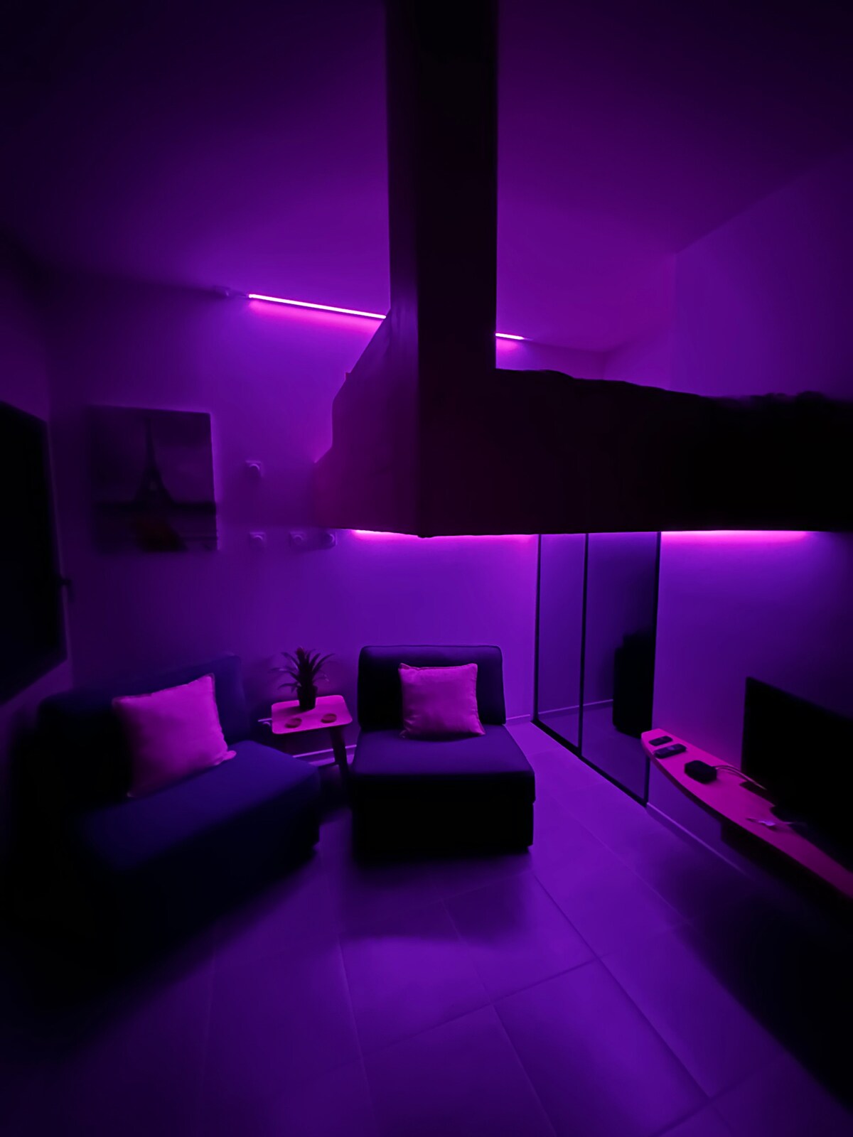 Lichte duplex op de 1ste verdieping en op de bovenste verdieping van een huis. Volledig nieuw en ingericht, ontdek je een grote open woonruimte met een ingerichte keuken, eetkamer, woonkamer, apart toilet en opbergmeubilair. De woonkamer heeft een slaapbank voor twee personen Boven, een slaapkamer met tweepersoonsbed, kleedkamer en badkamer (toilet en wasmachine). Wifi-koelkast, oven, fornuis, afzuigkap, magnetron, vaatwasser, koffiezetapparaat, koffiezetapparaat, koffiezetapparaat, waterkoker, waterkoker, keuken