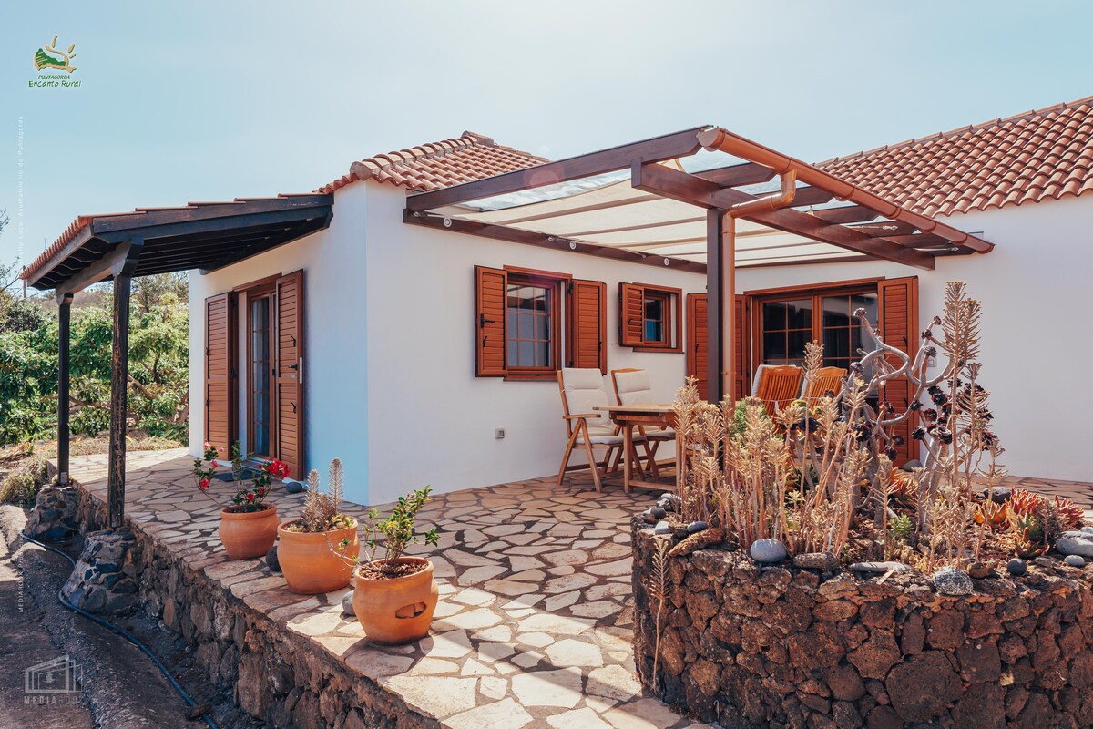 Perfecte vakantie op onze biologische, permacultuur finca met 6000 m ² tropische tuin in het zonovergoten westen van de groene Canarische Eiland. Geniet van rust en stilte op ongeveer 600 meter boven zeeniveau en een prachtig panoramisch uitzicht op de Atlantische Oceaan. Op 100 vierkante meter biedt ons huisje met airconditioning twee slaapkamers met tweepersoonsbed, een ruime woonkamer, een grote keuken met eethoek, verwarming en open haard, evenals verschillende terrassen, gedeeltelijk overdekt. Ken je zorgen in deze ruime en rustige accommodatie.