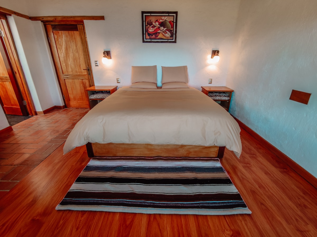 Geniet van een comfortabel en gezellig verblijf in deze ruime kamer met een bevoorrechte locatie dicht bij de belangrijkste laan 6 de Agosto en boarding voor Isla del Sol. 🛏️ Wat de kamer te bieden heeft: • - Queensize bed • Met de hand geschilderde muurdecoratie geïnspireerd op de Middellandse Zeekust • Woonkamer met ronde tafel voor werk • Eigen badkamer en kabel-tv • Verwarming voor koude klimaten • een elektrische waterkoker 📍 Gelegen in het Hotel Lago Azul. Reserveer nu!