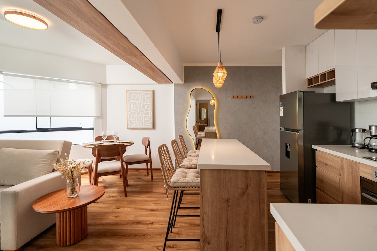 🛏 Loft Distribution: • Master Bedroom: Relax in a comfortable and spacious Queen bed, we have a closet, TV. Perfect for two people🧍🏻🧍🏻. • Cozy Living Room: A perfect space to disconnect. • Fully Equipped Kitchen: Prepare your meals with ease, it has the necessary appliances. • Full Bathroom: Bathroom equipped with amenities. 📸 Discover the beauty on our ig: @vibrant.homesperu