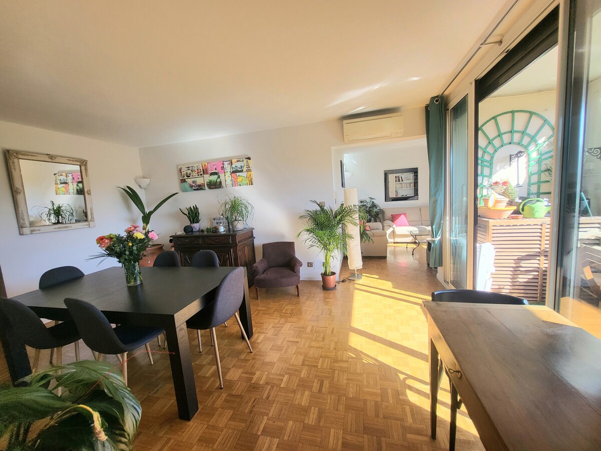Kunstenaarsappartement, atypisch, groen gerenoveerd, op de 5e en bovenste verdieping (geen lift) van een typisch Marseille-gebouw eind de 19e. Panoramisch uitzicht op het centrum van Marseille. Aan de horizon de Goede Moeder, de zee, de Blauwe Kust, Friuli. Ideaal voor een rustig verblijf in het hart van het leven in Marseillaise: treinstation, oude haven op 15 minuten lopen, op 5 minuten van de Plaine en Cours Julien; metro, tram en bus op 5 minuten afstand. Kantoor/mezzanine ontspanning, muziekruimte met piano, enscenering met tweepersoonsbed en uitzicht op 5th Ciel!
