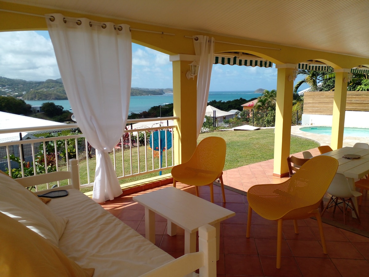 Magnifique vue sur la mer des Caraïbes ! Très belle villa, calme et reposante, située dans une résidence dès plus prisées, qui surplombe la grande baie. Les réveils sont lumineux et les couchers de soleil sont à couper le souffle. Le premier bain de mer à 4 mn en voiture. La villa est aménagée avec goût, des matériaux de qualité et totalement équipée. Piscine au sel. Jardin. BBQ. Localisation idéale pour rayonner partout sur l'île. Parking privé sécurisé pour 2 voitures. Supermarché à 5 minutes.