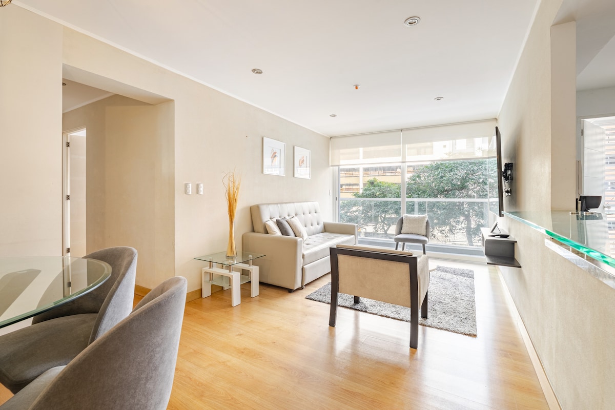 Modern en gezellig volledig ingericht appartement in het hart van Miraflores (Av. José Pardo), op steenworp afstand van Kennedy Park, de Malecón en Larcomar. Ideaal voor toerisme of werk. Het heeft 2 slaapkamers: hoofdslaapkamer met queensize bed en secundair bed met een 2-zits slaapbank plus een extra 1,5-zits. Een woonkamer met een queensize slaapbank en een balkon met uitzicht. Snel wifi, uitgeruste keuken, smart-tv, zwembad, fitnessruimte en 24/7 bewaking.