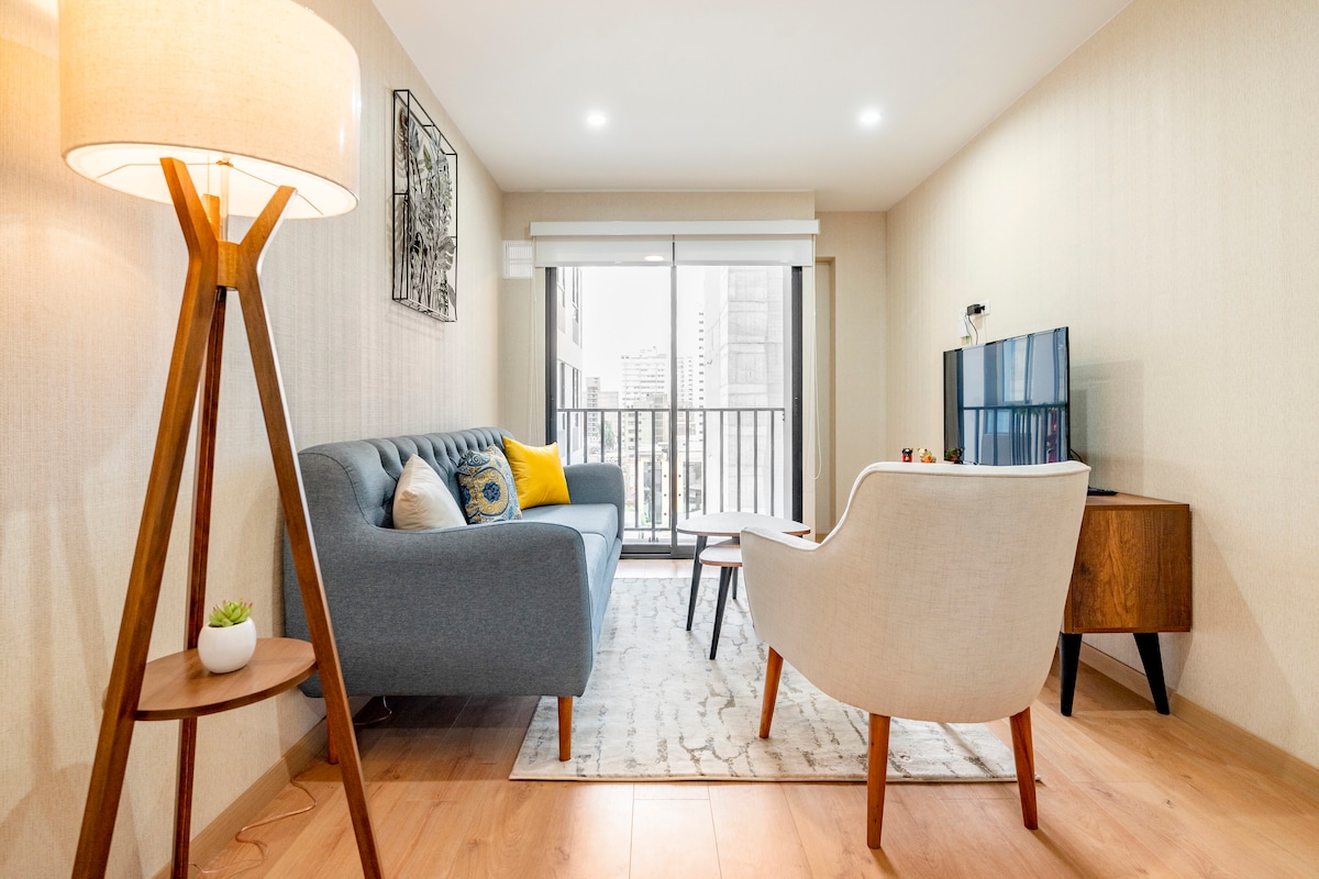 ** Première appartement. Meest centrale deel van de stad, op een steenworp afstand van San Isidro** 100% uitgerust, mooie gemeenschappelijke ruimtes zoals een fitnessruimte, terras, grills op het dak, een spectaculair uitzicht. Centraal gelegen en perfect om Miraflores, Barranco, Lima Centro te verkennen. Winkelcentra in de buurt, uitgaansgelegenheden en restaurants. Verdieping 8 van een modern gebouw van 25 verdiepingen, heeft wifi. Volledig uitgeruste keuken, badkamer en een kamer met een queensize bed. Sleutel- en slimme vergrendeling
