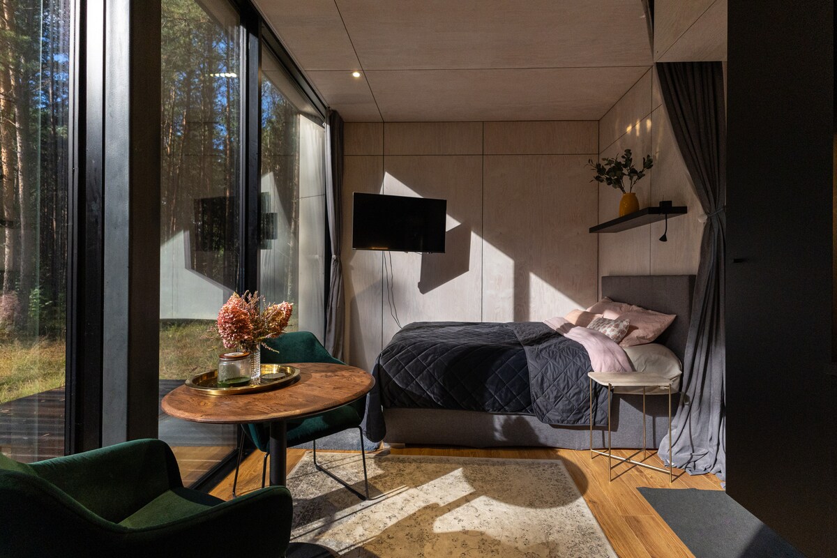 Dit compacte, moderne tinyhouse ligt aan de westkust van Estland. Bedoeld voor mensen die willen genieten van een natuurlijk toevluchtsoord zonder moderne gemakken op te geven. Het huis beschikt over een sauna, bubbelbad, een douche met verwarmde vloeren, toilet, een open woonkamer en een slaapgedeelte op de 'zolder'. Het huis is uitgerust met wifi, tv met Netflix-toegang, koffiezetapparaat enz. Verwarming/koeling wordt verzorgd door een geïntegreerde airconditioner De woning is het hele jaar door te genieten.