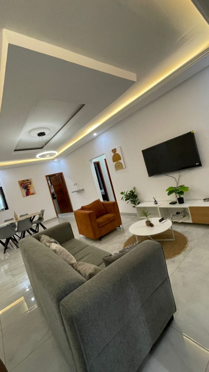 Amusez-vous avec toute la famille dans ce logement très chic. - 3 chambres autonomes avec climatisation et TV connectée 43" - 1 grand salon avec TV connectée 55" et 1 salle à manger, avec climatisatisation - 1 salon secondaire en haut avec TV connectée 43" et accès à un grand balcon (pour vos apéros et soirées en plein air) - Cuisine entièrement équipée - Accès internet FTTH 200Mb/s - Groupe électrogène - Citerne d'eau 1m³ avec suppreseur