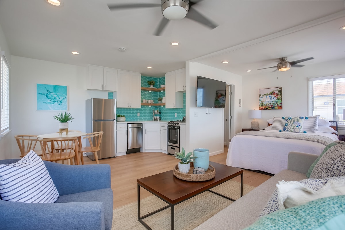 Volledig gerenoveerde studio DIT APPARTEMENT HEEFT GEEN TOEGEWEZEN PARKEERPLAATS • Gratis fietsen, boogieboards, strandspullen, speelgoed, enz. • Korte wandeling naar strand, pier, restaurants, trolley en winkels • Geluiddicht • Eigen werkplek en snelle wifi • Eigen balkon met barbecue • Keuken van de kok • Keurig koffie met pads • Luxe matrassen en beddengoed • Smart-tv met volledige streaming suite • Huisdiervriendelijk • Eigen ingang + zelf inchecken met toegangscode • Buitendouche • AC • Wasmachine en droger • Lees onze recensies :)
