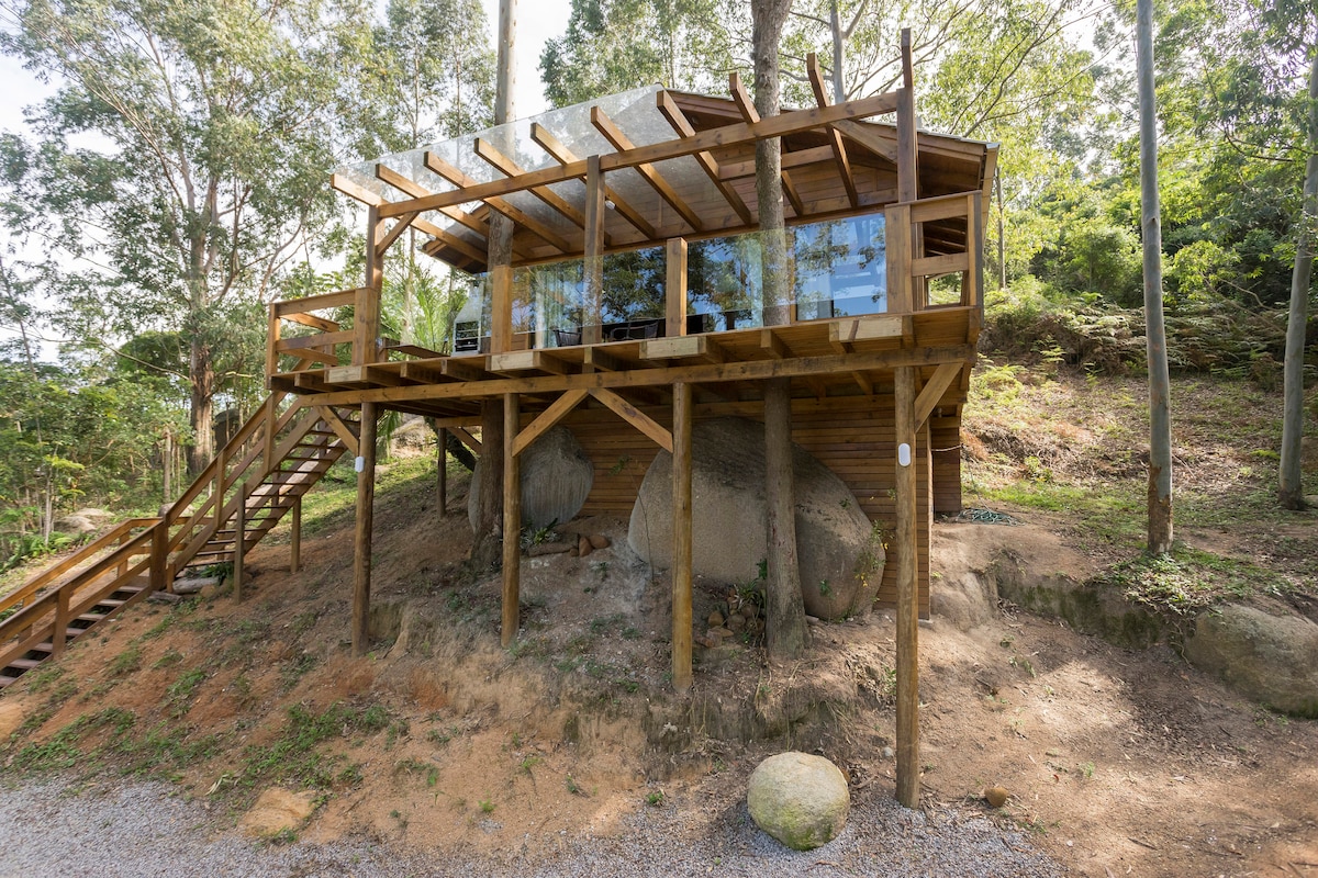 Het chalet is een omgeving voor 1 stel en had zijn fundering gepland om te profiteren van alles wat de natuur biedt aan de site, dus voor de bouw ervan werd er geen boom gekapt of werd er geen steen verwijderd en dat is precies wat alle charme aan de plek geeft, die een hart heeft dat zich vormt op de rots al bij de ingang. Het chalet heeft een moderne inrichting, rustige sfeer en een adembenemend uitzicht. Hier zal het stel een romantische ervaring hebben en erg rustig zijn.