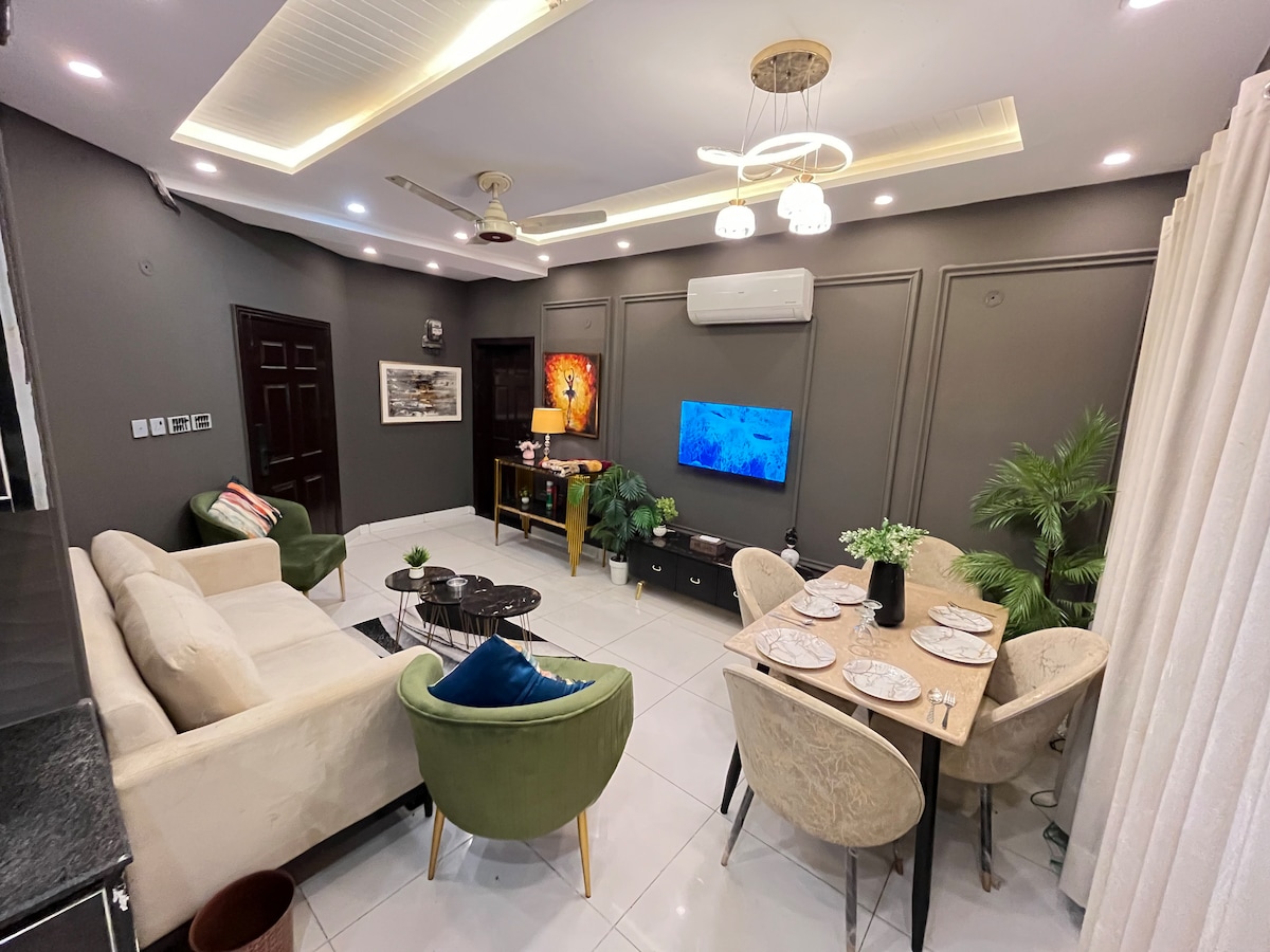 Welkom bij Twilight – een uniek appartement met een maanthema in DHA Fase 6 🌙 • 1-slaapkamer met gezellige verlichting & modern design • Stijlvolle lounge met kunstzinnige inrichting en 50inch Smart LED •Volledig ingerichte keuken met fornuis, magnetron en waterkoker • Snelle wifi en naadloos zelf inchecken 📍 Toplocatie in de buurt van Raya Commercial, Dolmen Mall, Ring Road en vele cafés Je perfecte mix van comfort en stijl. Het is de beste optie of je reist voor zaken of voor je vrije tijd.