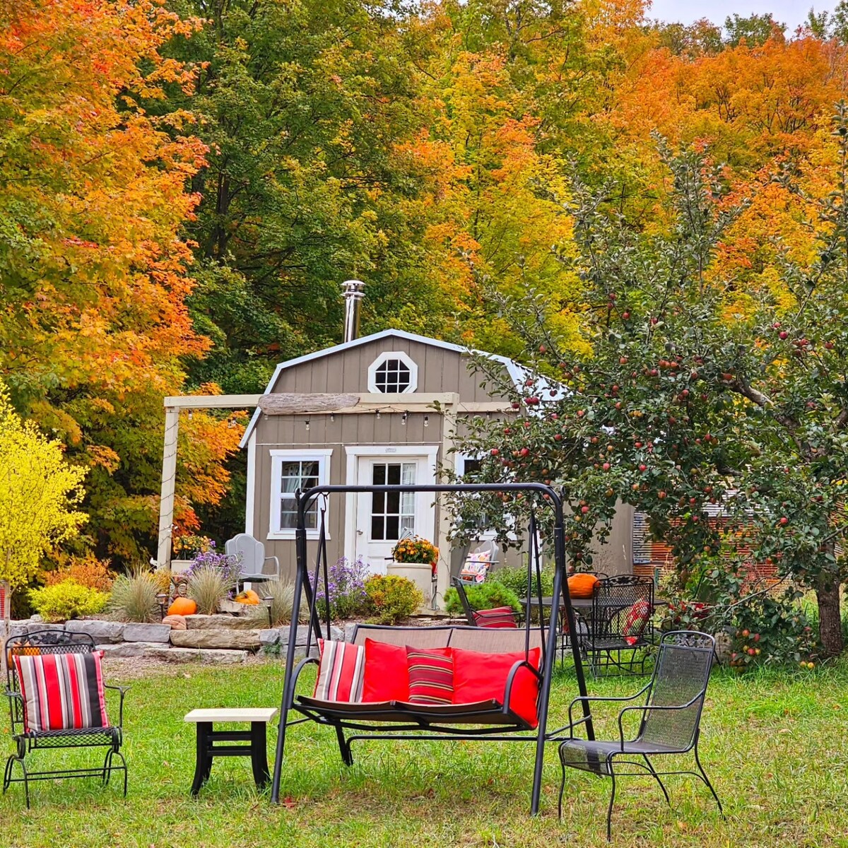 Stijlvol, een kamer woonachtig in een prachtig, centraal gelegen Leelanau - bruisend dorp van het meer van Leelanau, dicht bij Leland. Ons pension is licht en helder , met uitzicht op de schoonheid van de tuinen vanuit een warme en gezellige ruimte. We verwelkomen bezoekers en hopen dat je comfort vindt in ons milieuvriendelijke, door zonne-energie aangedreven tiny house. Een grote comfortabele bank, knusse loftbed, zachte lakens, inloopdouche en minikoelkast. Geweldige belangrijkste locatie in het dorpscentrum, gemakkelijke wandeling naar wijnmakerijen, restaurants en supermarkt. Perfecte uitvalsbasis voor ontspanning en verkenning!