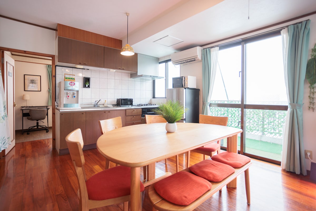 Geweldige locatie: 7 minuten met de auto van Naha Airport en ongeveer 5 minuten naar de snelweg IC, gemakkelijk te vinden op een hoofdweg. 16 minuten (6 km) naar Kokusai Street. 1 gratis parkeerplaats, ideaal voor een langer verblijf, werken op afstand en zakenreizen. 2 minuten lopen naar huurauto's: Sky Rent-a-Car, Mahalo Rent Veel winkels en restaurants in de buurt. Gratis snelle wifi, droger en waterdispenser. Gehele privévloer op de 3e verdieping met 2 slaapkamers. Maximaal acht personen. Gezinsvriendelijk met kinderspeelgoed en babyartikelen. Volledig uitgerust voor een langer verblijf.