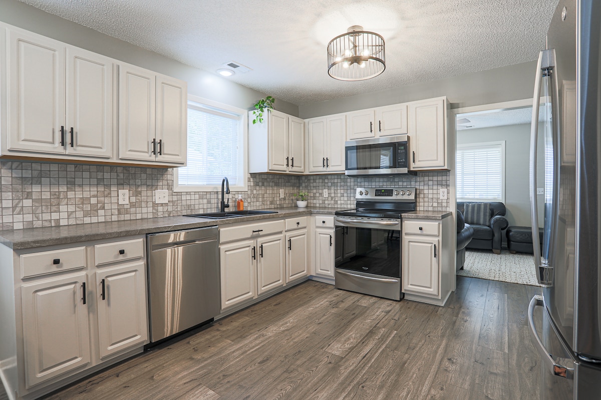 Stap in een privé en gezellige ruimte. Ontspan om tv te kijken in bed of op de bank. Deze plek maakt deel uit van onze uitloopkelder, dus je kunt van dag tot dag boven horen wonen. Voor je eigen veiligheid is er een ringcamera geïnstalleerd bij de ingang en deze zal de ingang verlichten als het donker is. Parkeren is in de goed verlichte openbare straat. Loop gemakkelijk langs onze toegewijde stoep van Airbnb, geen trappen, loop rond naar de achterkant van het huis. Je bevindt je in een serene ruimte waardoor je direct thuis voelt.