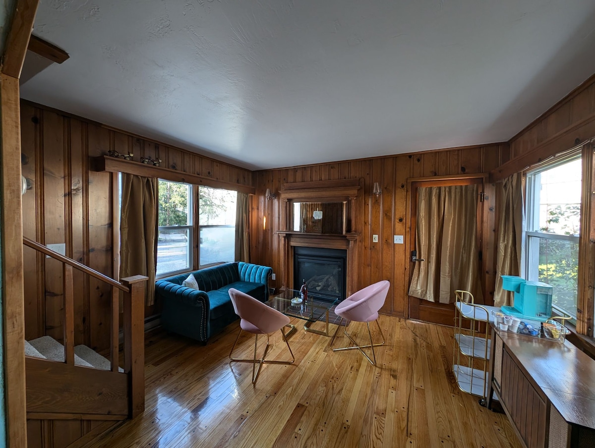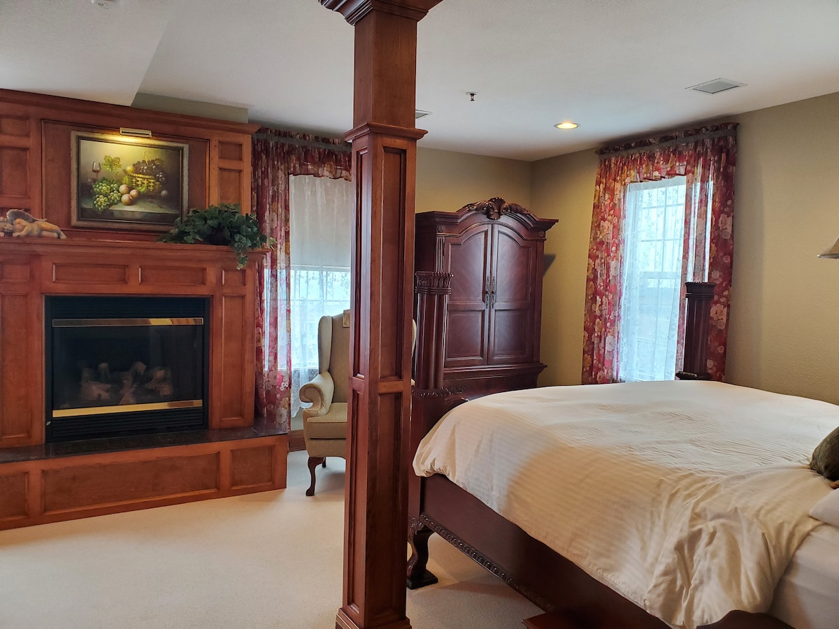 The Port Hotel - KAMER 302 - The Welcome - Een lichte, ruime kamer op de derde verdieping met een kingsize bed, hoge plafonds, een eigen badkamer met inloopdouche, een bureau en een stoel, een hoekgashaard en een natte bar. Geniet van het uitzicht op het centrum van Port Washington en het meer.