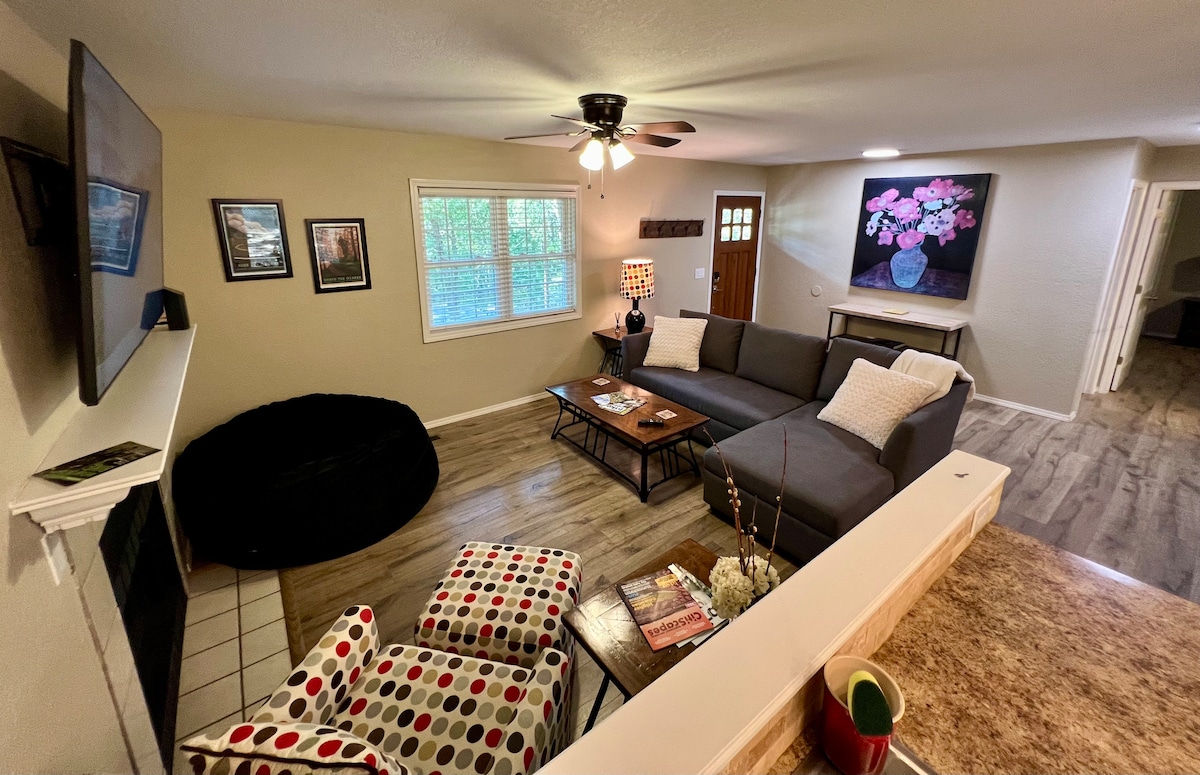 Kom, ga zitten. Blijf spelen. Ontspan in deze rustige, met bomen omzoomde ontsnapping met een prachtige veranda, volledige privacyhek en uitnodigend terras met een vuurplaats in de achtertuin. Slechts 1 mijl naar Back40-paden, Kingswood/Berksdale golf over de hoofdweg, en 0,6 mijl naar Lake Rayburn. Weggestopt voor rustig comfort en toch dicht bij de snelweg. Geniet van een volledig gevulde keuken en een ontspannende jacuzzi na je avonturen.