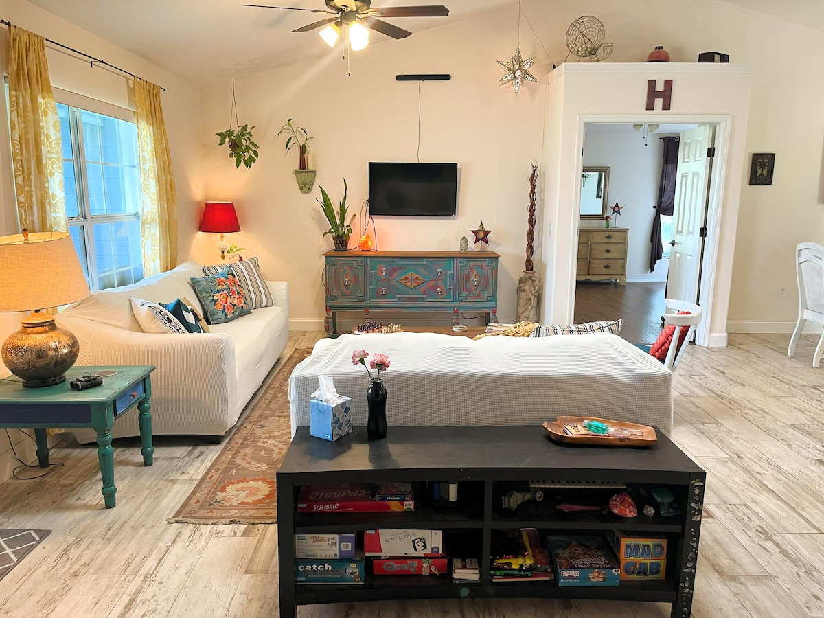 Ontsnap naar dit rustige, stijlvolle gastenverblijf, verscholen in een privéhoek van St. Cloud, omgeven door natuur. Met een volledig uitgeruste keuken, gezellige loft slaapkamer met een tweepersoonsbed en woonkamer met een queensize slaapbank, kan het huis tot 4 gasten slapen. Grill buiten of ontspan in de grote afgeschermde veranda. Met een pingpongtafel, cornhole en bordspellen combineert het comfort, plezier en sereniteit. Dicht bij Wild Florida, Downtown St Cloud, Kissimmee, themaparken en minder dan een uur van het strand.