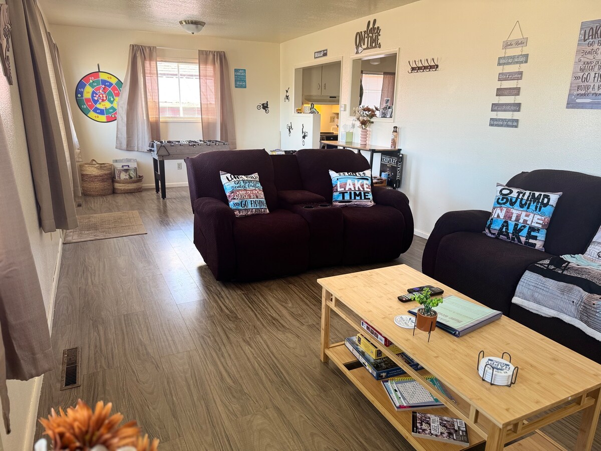 We are located uptown, only 4 minutes from Winchester Bay! The neighborhood is very quiet and comfy. There is a fully stocked kitchen with lots of gadgets, a Keurig coffee pot with a random assortment of kcups, and gas BBQ, and a bar for good conversation. In the Livingroom we have Spectrum cable TV and high speed WiFi. There are 2 bedrooms with one king and one queen bed both upstairs. There is plenty of room for an air mattress in the Livingroom, which is in the closet downstairs!