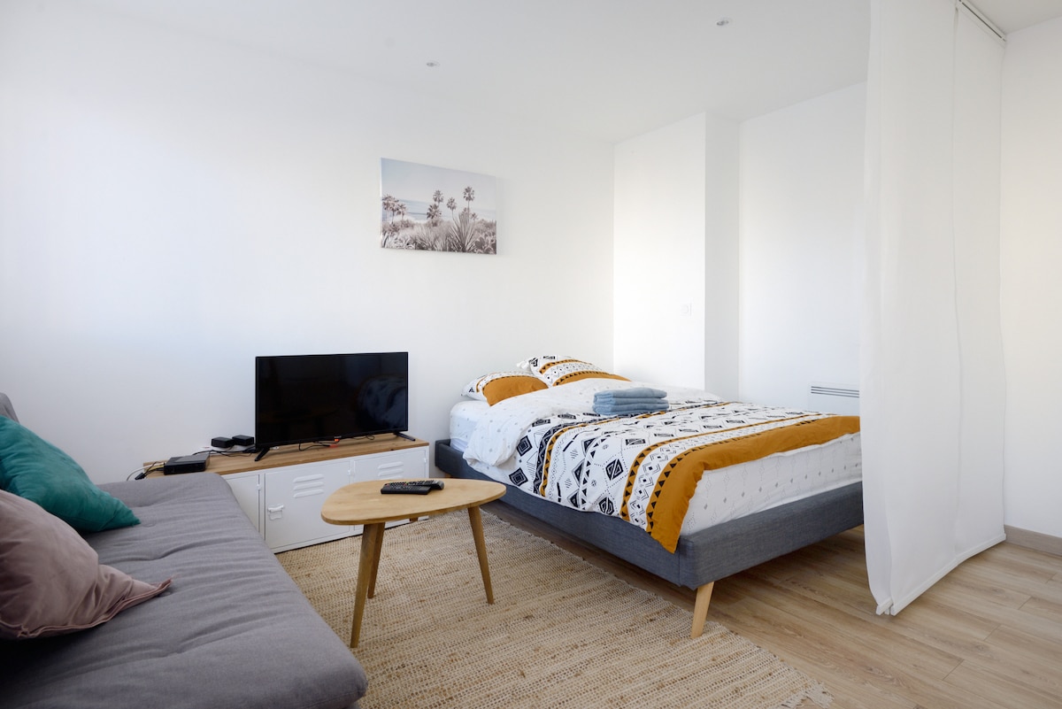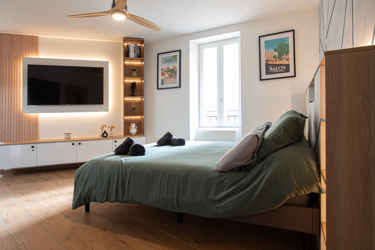Na een dag sightseeing in of rond Salon de Provence kunt u in dit ruime studio-appartement uitrusten als in een cocon in het hart van de stad. Je bevindt je op een rustige plek en beschut tegen de zomerhitte, terwijl je blijft genieten van de sfeer van de vakantie. Je zult genieten van deze studio met een natuurlijke inrichting. De frisse kleuren zullen je inspireren om een goede vakantiegeur te hebben!
