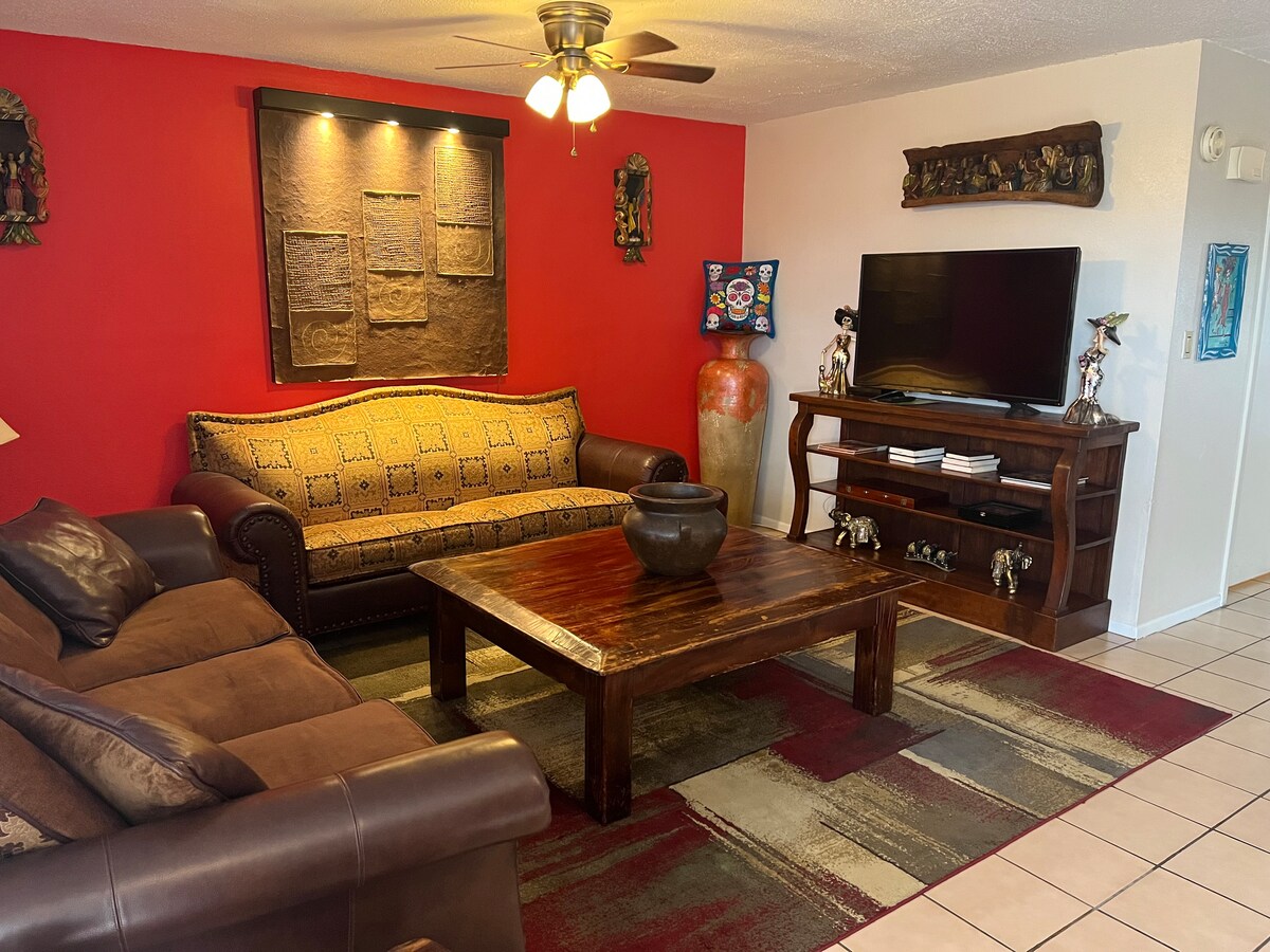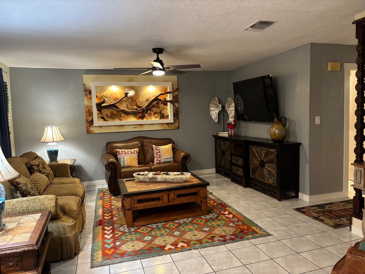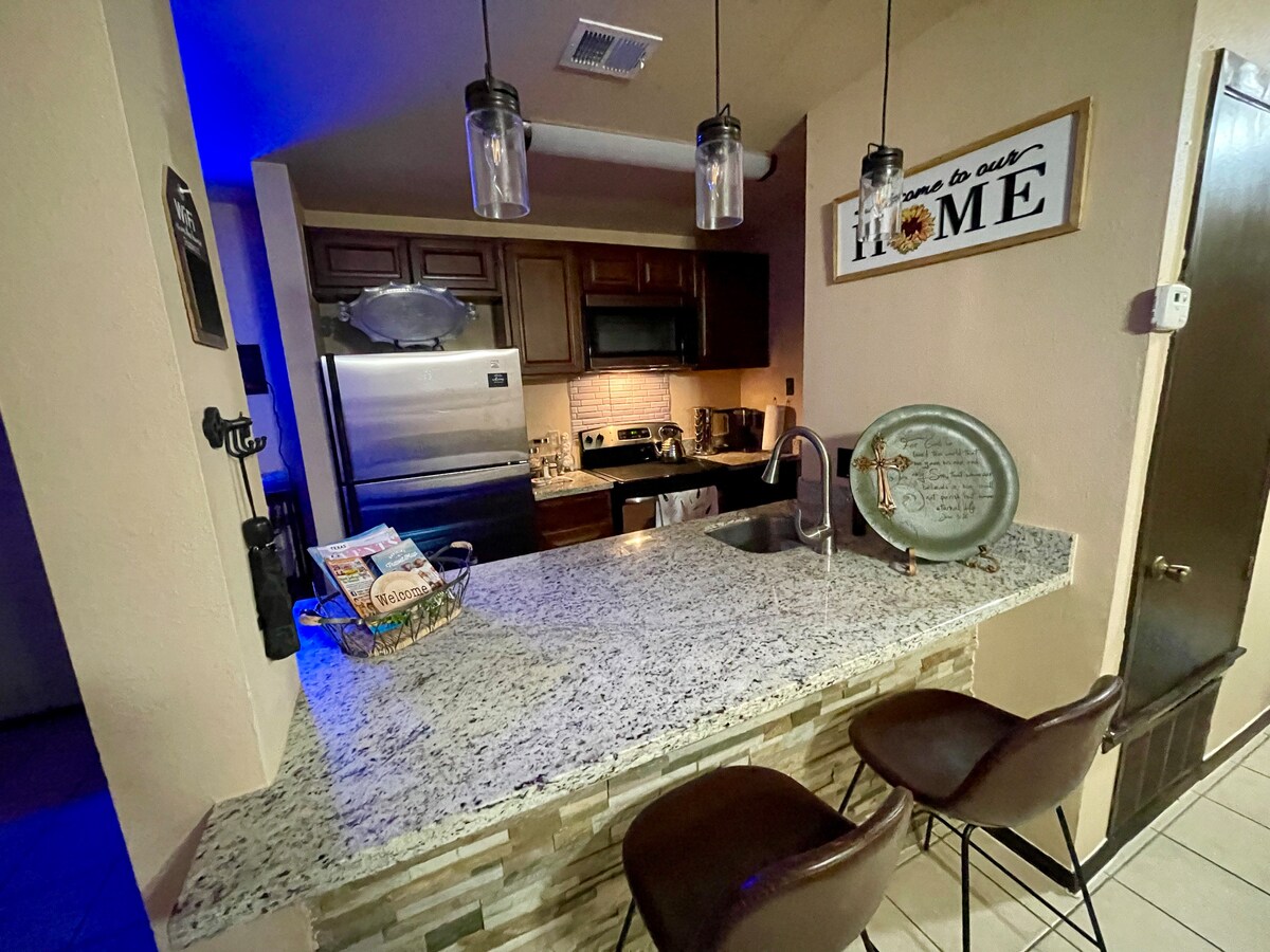 Nieuwe apparaten en meubels! We hebben veel tijd en moeite besteed om onze plek te perfectioneren, zodat je je thuis voelt. Ons appartement heeft een gezellige rustieke sfeer, waaronder een 55-inch smart-tv, snellaadstations en andere voorzieningen voor een kort / lang verblijf. Je bevindt je op een toplocatie met het Laredo Medical Center, Doctors Hospital Emergency Room en de Laredo International Airport in de buurt. Verschillende restaurants en supermarkten allemaal op korte afstand.