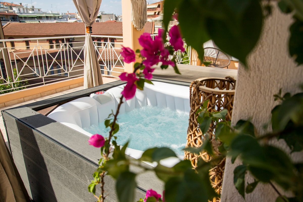 Een speciaal verblijf met een onbeperkt uitzicht op het plein. Op het grote terras van 100 m² ontspan je en geniet je van de verwarmde jacuzzi, het 150-inch gigantische scherm voor een filmische ervaring, de barbecue en de eetkamer voor zes personen met uitzicht op Ag. Konstantinou. Het heeft een woonkamer met een slaapbank en een aparte slaapkamer, het is geschikt voor maximaal vier personen. 2 40 inch Smart-tv's met Netflix/YouTube. Op de 4e verdieping (de lift bereikt de 3e verdieping en je moet een verdieping omhoog lopen)