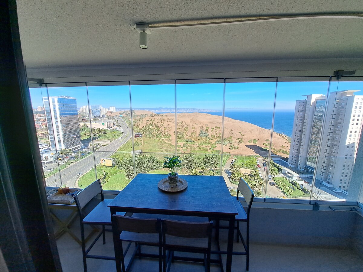 Kom en geniet van het comfort van dit nieuwe appartement met een prachtig uitzicht op de stad Concón. We hebben een uitstekende locatie op loopafstand van supermarkten , restaurants, een park met kinderspelletjes, stranden en duinen. Het appartement heeft: queensize✓ bed met drimkipmatras (memory foam) ✓ Smart-tv met snelle✓ wifi ✓ ✓ Verwarmingsterras, aanrecht en elektrische oven ✓ Parkeergebouw ✓ heeft een prieel , speelkamer, buitenzwembad en wasserette. Welkom!
