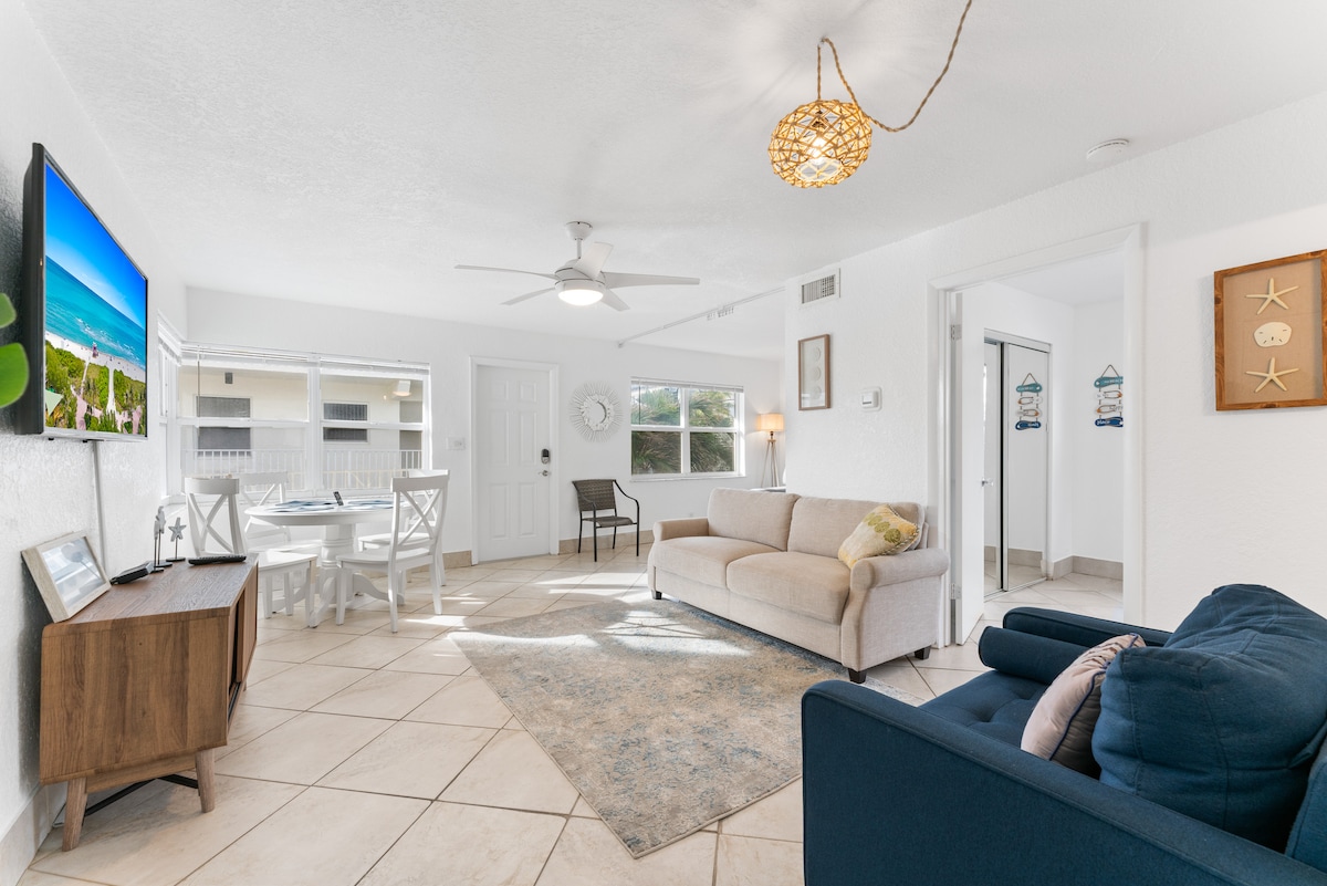 Geniet van een ruim appartement met 1 slaapkamer met directe toegang tot een gedeeld verwarmd zwembad op hetzelfde niveau. Het appartement beschikt over een kingsize bed, wasmachine en droger, vaatwasser, volledig uitgeruste keuken en biedt één set handdoeken per gast, samen met strandhanddoeken en stoelen. Blijf verbonden met snel internet en een smart-tv. Let op: van 1 november tot 30 april geldt een zwembadvergoeding van $ 25/dag. Eén kleine hond (tot 15 Ib) is toegestaan, extra kosten voor honden die verharen.