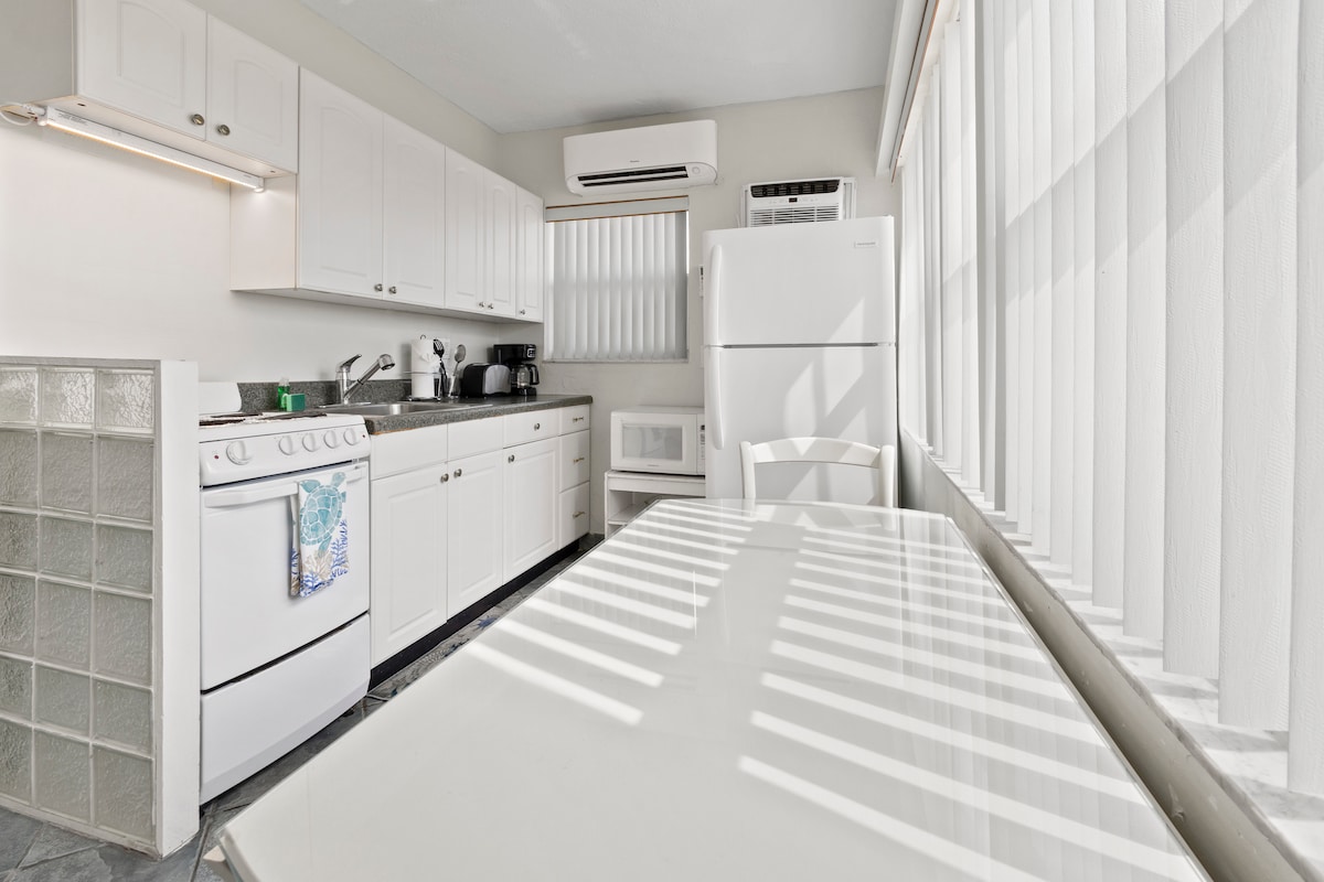 Luxe privéstudio met eigen ingang (440 vierkante voet - geschikt voor 3 personen/2 auto 's) is aan ons huis bevestigd en 1,7 mijl van het strand en grenzend aan Fort Lauderdale. Parkeer onder de overdekte carport. 1 queensize bed (en 1 queensize bed), 1 badkamer, kitchenette, glasvezel-wifi, flatscreen-tv (140 kanalen), impactramen, enorme kast, ventilator/licht, airconditioning met afstandsbediening, bureau, stoel, opklapbare tafel om te eten met stoelen, kleine koelkast, magnetron, broodroosteroven, voormangrill, kookplaat, fornuis, koffiezetapparaat.