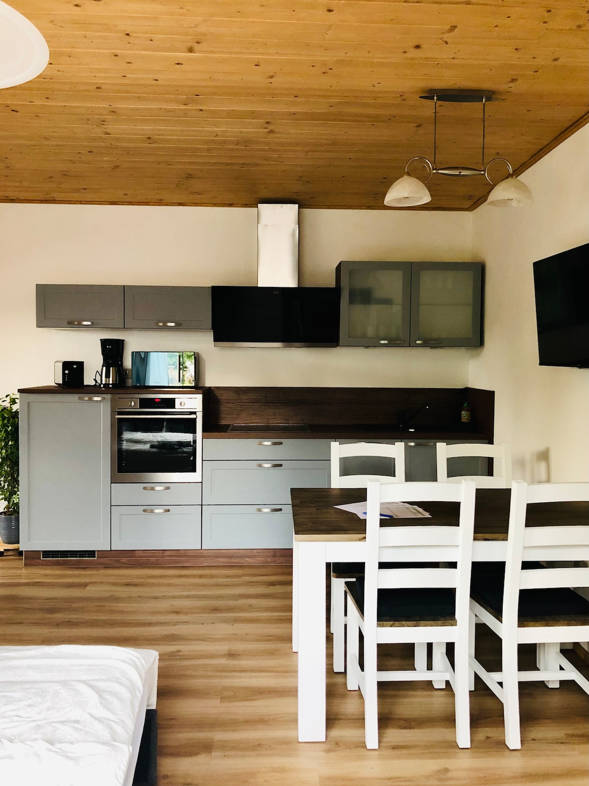 “Welcome to your freshly renovated wellness oasis! Relax and unwind in the private whirlpool, enjoy deep relaxation in the infrared sauna for two, and end the day with cozy movie nights in the home cinema. The fully equipped kitchen invites you to cook. In the fridge you’ll find soft drinks as well as local beer and wine specialties (at near cost price). Your perfect place to recharge.”