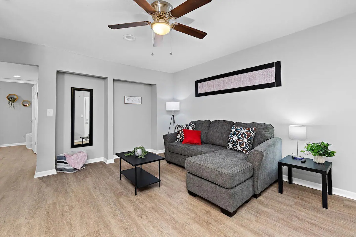 Deze duplex is de perfecte stop voor een vermoeide reiziger! Slaap in een groot kingsize bed of een verstelbaar queensize bed! Garage om in te parkeren. Deze plek is volledig toegankelijk voor gehandicapten. Eén verdieping, anti-allergeen hardhouten vloeren overal. Inloopdouche met handgrepen. Verhoogde commode. Voor het comfort van de woonkamer bieden we een massagestoel, elektrische ligstoel, Xbox Game-systeem en tv met premium kanalen op Roku! Keuken is erg open en volledig gevuld. 10 minuten van KU & het centrum 5 minuten naar i-70.
