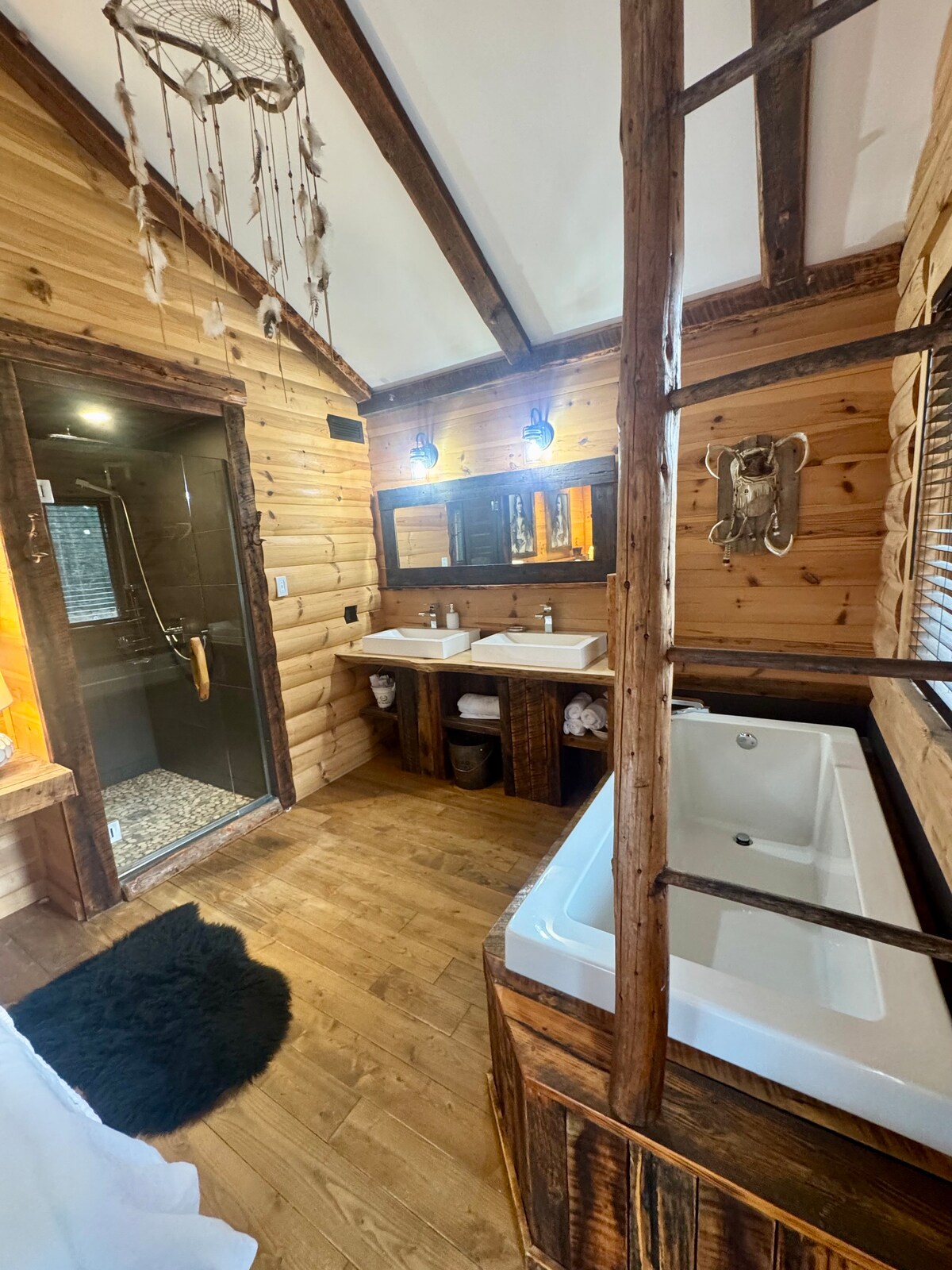 Deze hut van 350 vierkante voet is gebouwd in stuk per kamer hout dat perfect in harmonie is met de omliggende natuur. De volledig aan de voorkant met ramen geeft je het gevoel dat je buiten verblijft en onder de sterren slaapt, zelfs in de kelder. Het steile uitzicht op de klif zal je charmeren! Buiten vind je een terras met stoelen om te ontspannen, een houtkachel en een eigen spa.