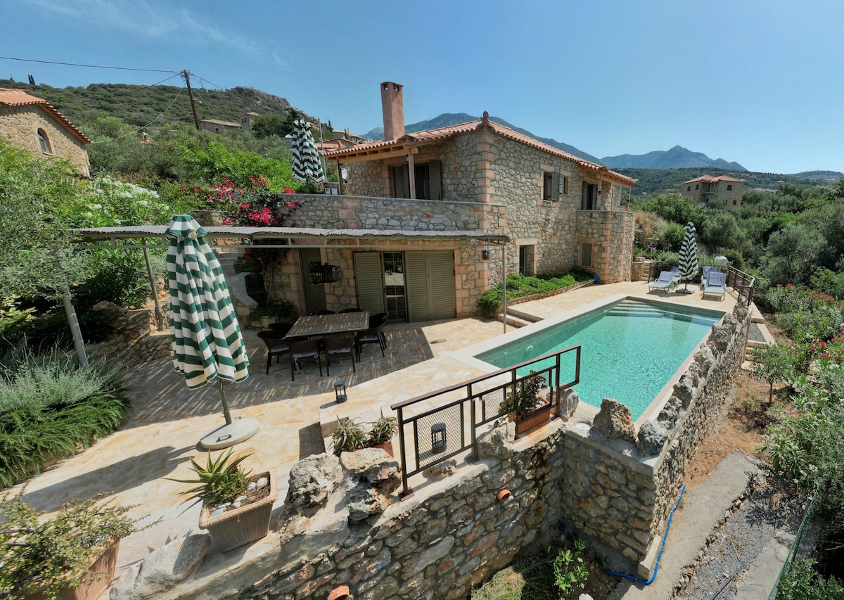 This newly built stone house with amazing pool was added by the owners to their existing house, situated in a large olive garden in the beautiful countryside overlooking the Messinian Sea. Blending perfectly with the traditional mani style, tastefully selected furniture and fabrics were used to decorate this special home. Amazing views to the mountains and the sea, completed by a roof top terrace for relaxing sun sets you will find plenty of space and privacy for a perfect holiday experience.