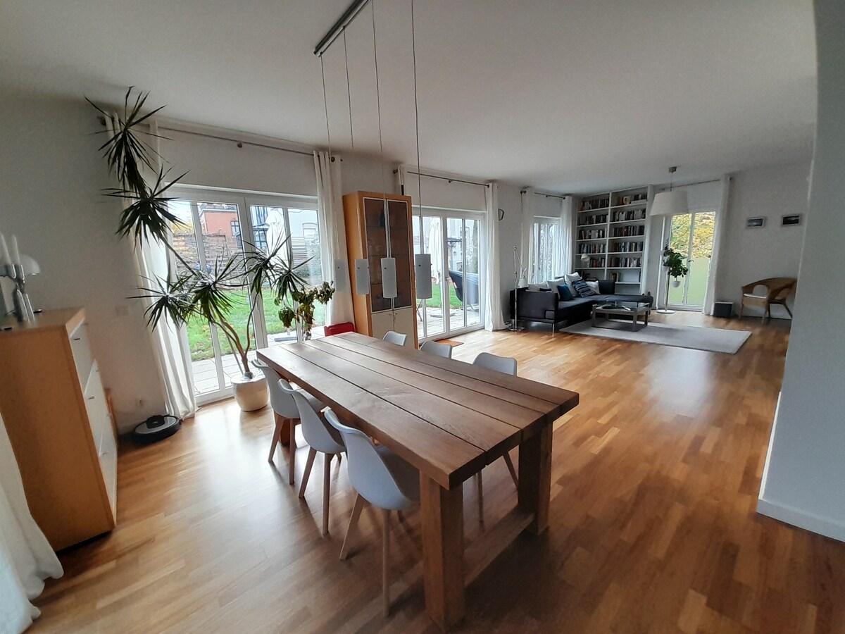Komfortables freistehendes Architektenhaus in Leipzig für bis zu 5 Personen. Das Stadtzentrum ist in 30 min zu erreichen, zur Autobahn A9 Abfahrt Leipzig-West sind es 15 min. Viele Einkaufsmöglichkeiten befinden sich in unmittelbarer Nähe. Das Haus hat einen großen Garten mit 2 Terrassen und liegt direkt am Elster-Saale-Kanal. Es verfügt über 3 Schlafzimmer und 2 Bäder. Ein privater Zugang zum Kanal mit kleinem Steg ist vorhanden. Gartensauna und Kajak/SuP sind auf Anfrage nutzbar.