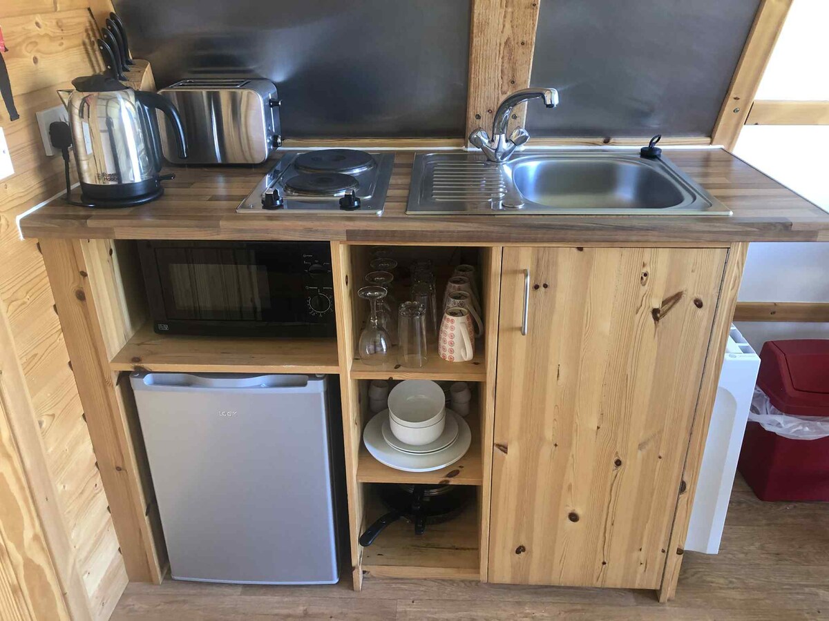 Hier is onze nieuwe goed uitgeruste Pod. Het heeft vloerverwarming,warm water, een koelkast/vriezer, een waterkoker,een broodrooster, een vast tweepersoonsbed en een slaapbank. Voor je comfort heeft het toilet,wastafel en douche. Ook wifi, tv/dvd, amazonbrandstok (netflix/kinder-tv, enz.). Het is zeer comfortabel en gezellig, met super zacht pluchef beddengoed en een zuiver wollen dekbed. Er is ook een bbq-ruimte met zitplaatsen en een vuurplaats voor relaxte avonden. De pod is aan het einde van een rustig dorp.